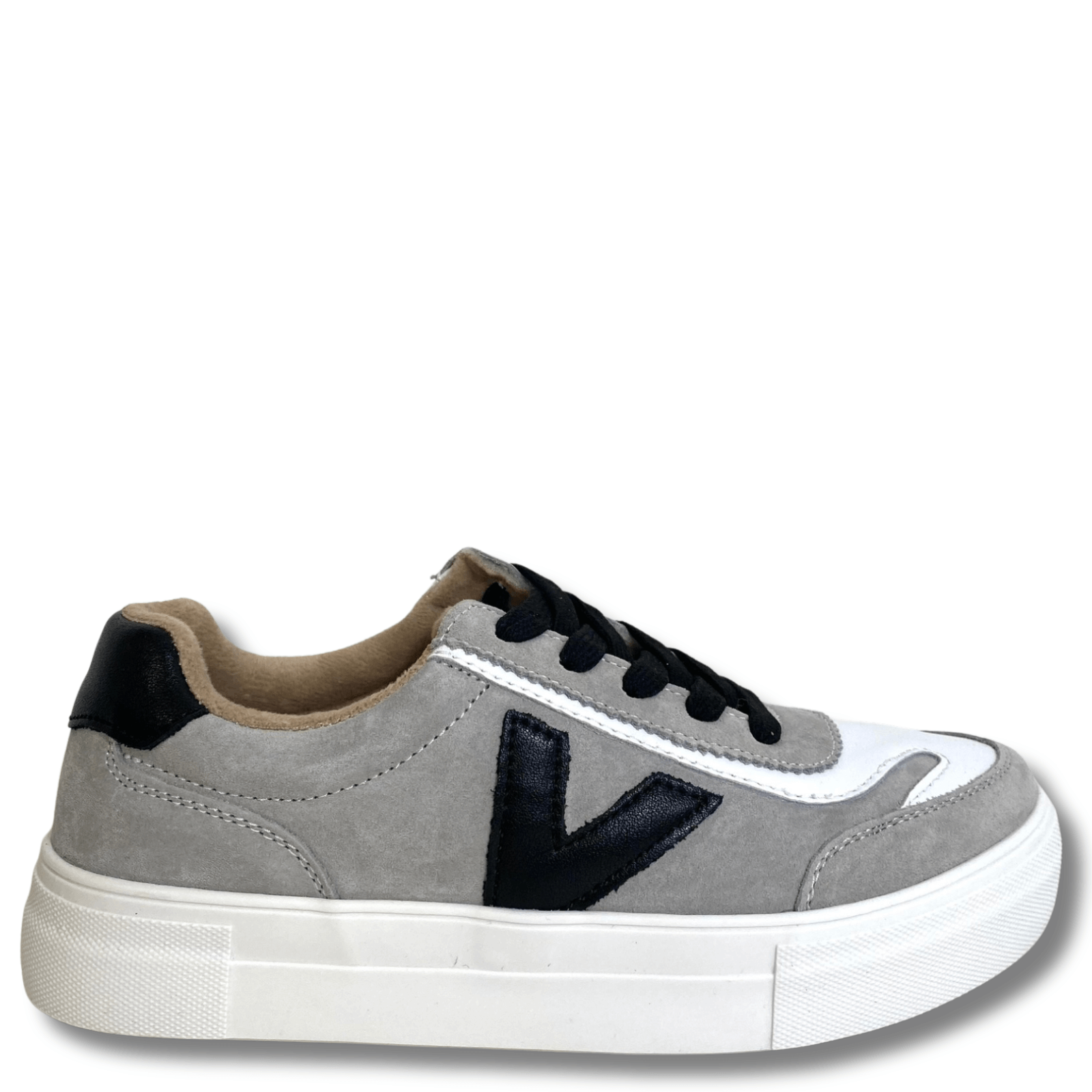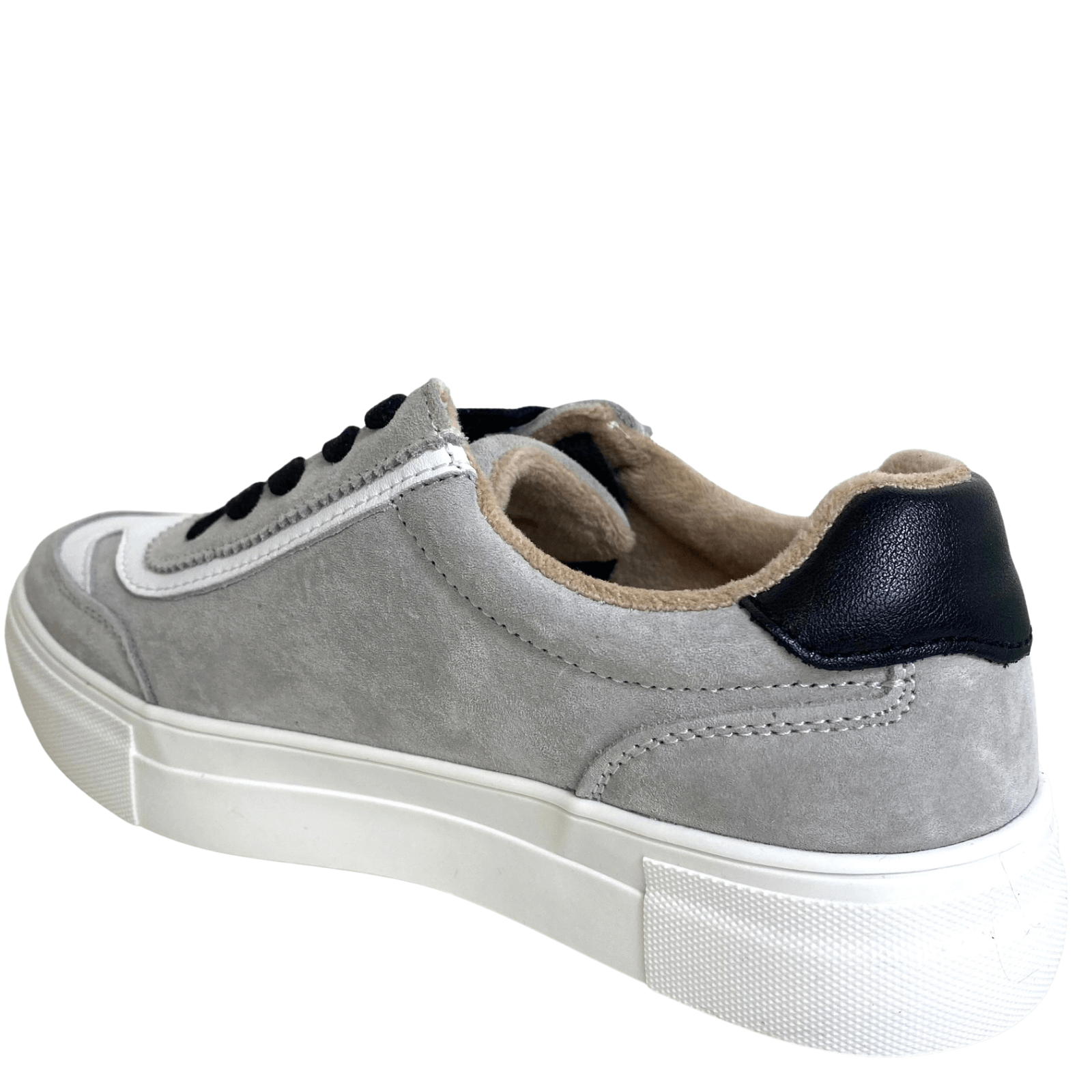Grey suede and white leather effect sneakers from Drilleys with elevated white sole.