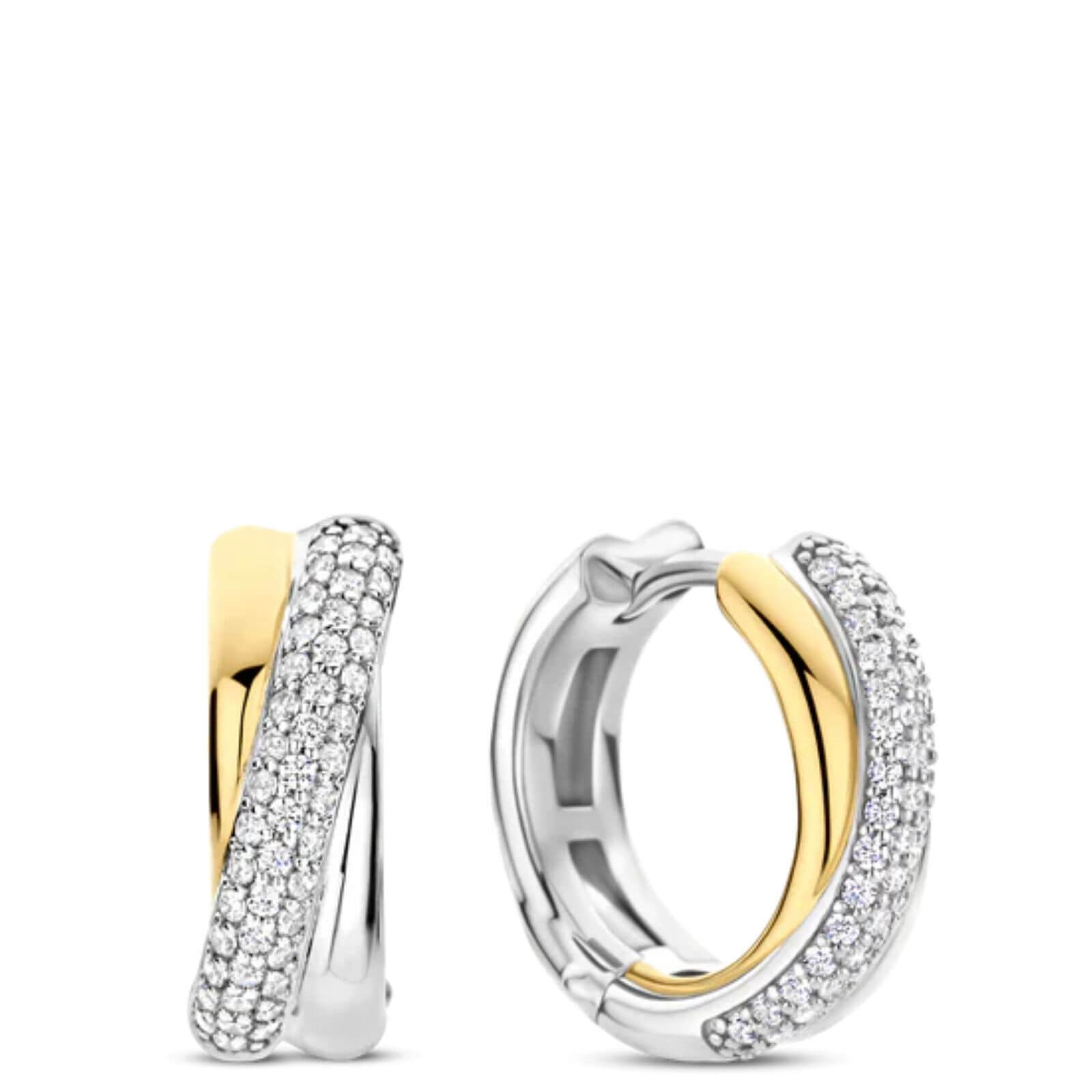 Celebrate modern balance with these TI SENTO tricolour silver Earrings 78012ZT. Crafted from 925 sterling silver, each 16 mm hoop blends radiant yellow gold and cool platinum plating in a fluid crossover design. A sweeping ribbon of pavé-set white cubic zirconia curves along the front, catching the light with every move. The sculptural silhouette brings depth and contrast, while the compact size makes them perfect for daily wear with a polished twist.