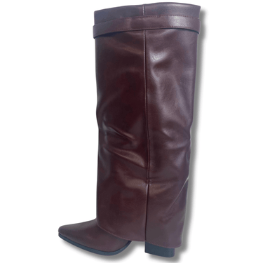 Introducing our latest fold over boots they are the ultimate night-out boot. A glamorous play on the cowboy boot trend. Featuring a luxury vegan leather material, just below knee-high height and block heel - we are obsessed.