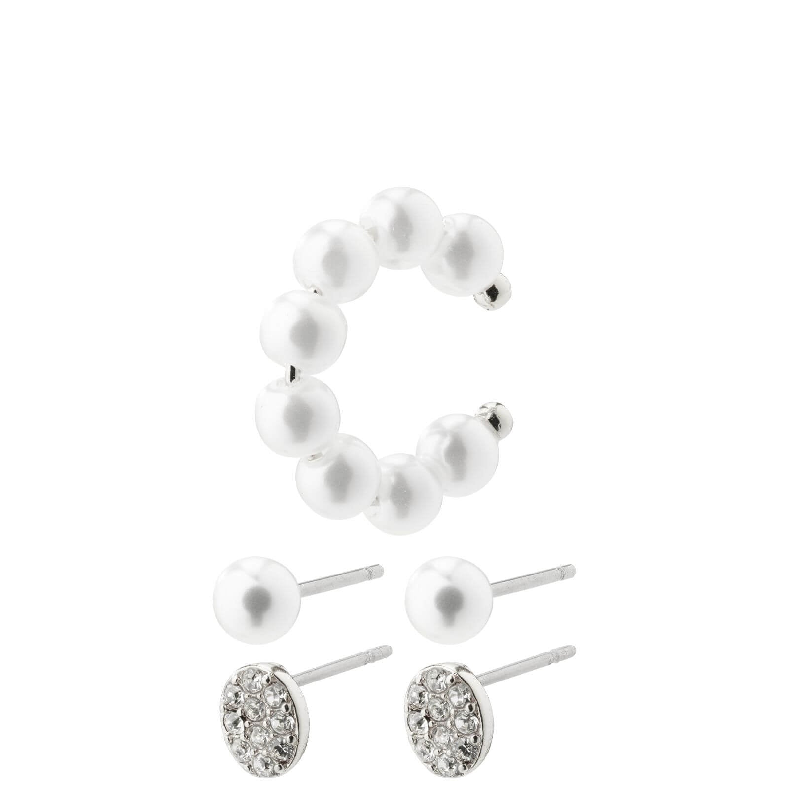 Chunky silver rhodium plated earrings with clear crystal and pearls, complete with pearl cuff from Pilgrim.