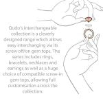 Qudo’s Interchangeable collection is a cleverly designed range which allows easy interchanging via its screw off/on gem tops. The series includes rings, bracelets, necklaces and earrings as well as a huge choice of compatible screw-in gem tops, allowing full customisation across the collection. Please ensure gem top is screwed on tightly before each wear and a black rubber spacer is worn at all times.