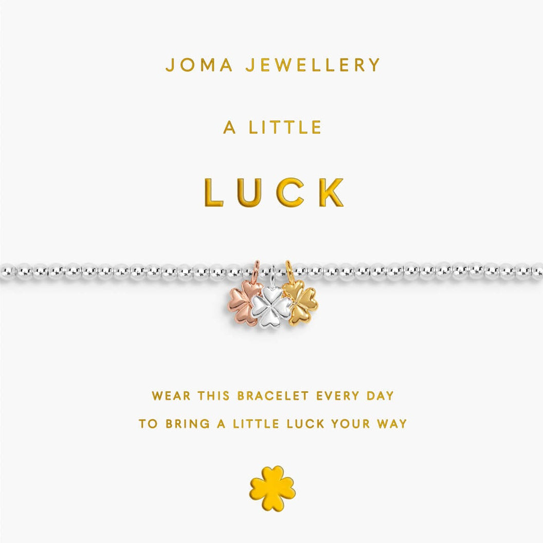 Joma Jewellery 'A Little Luck' bracelet set on a white card with gold text.