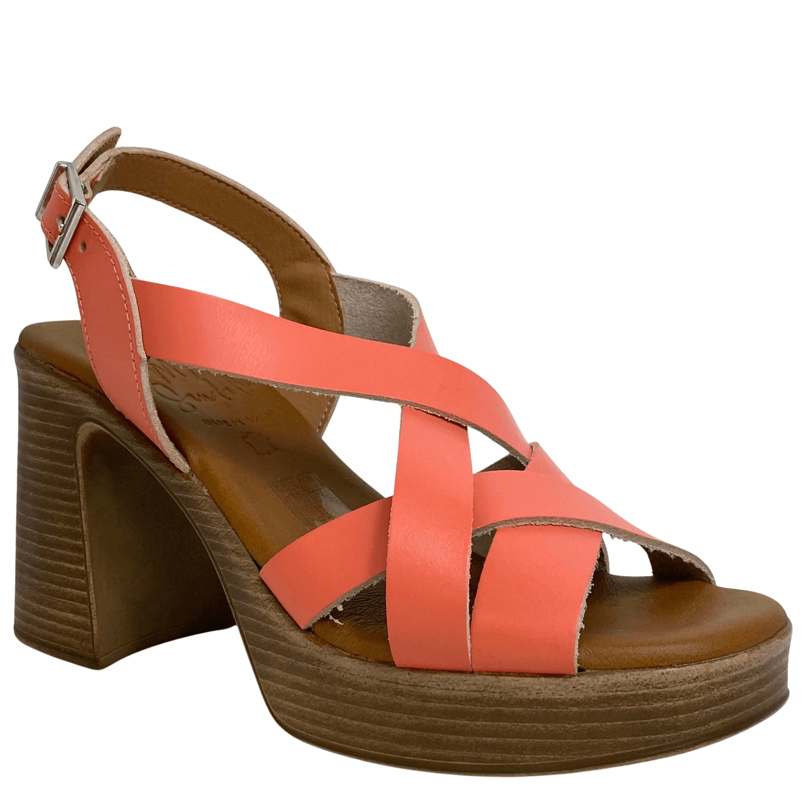 Ladies coral leather, block heel sandals in a strappy sling back style.