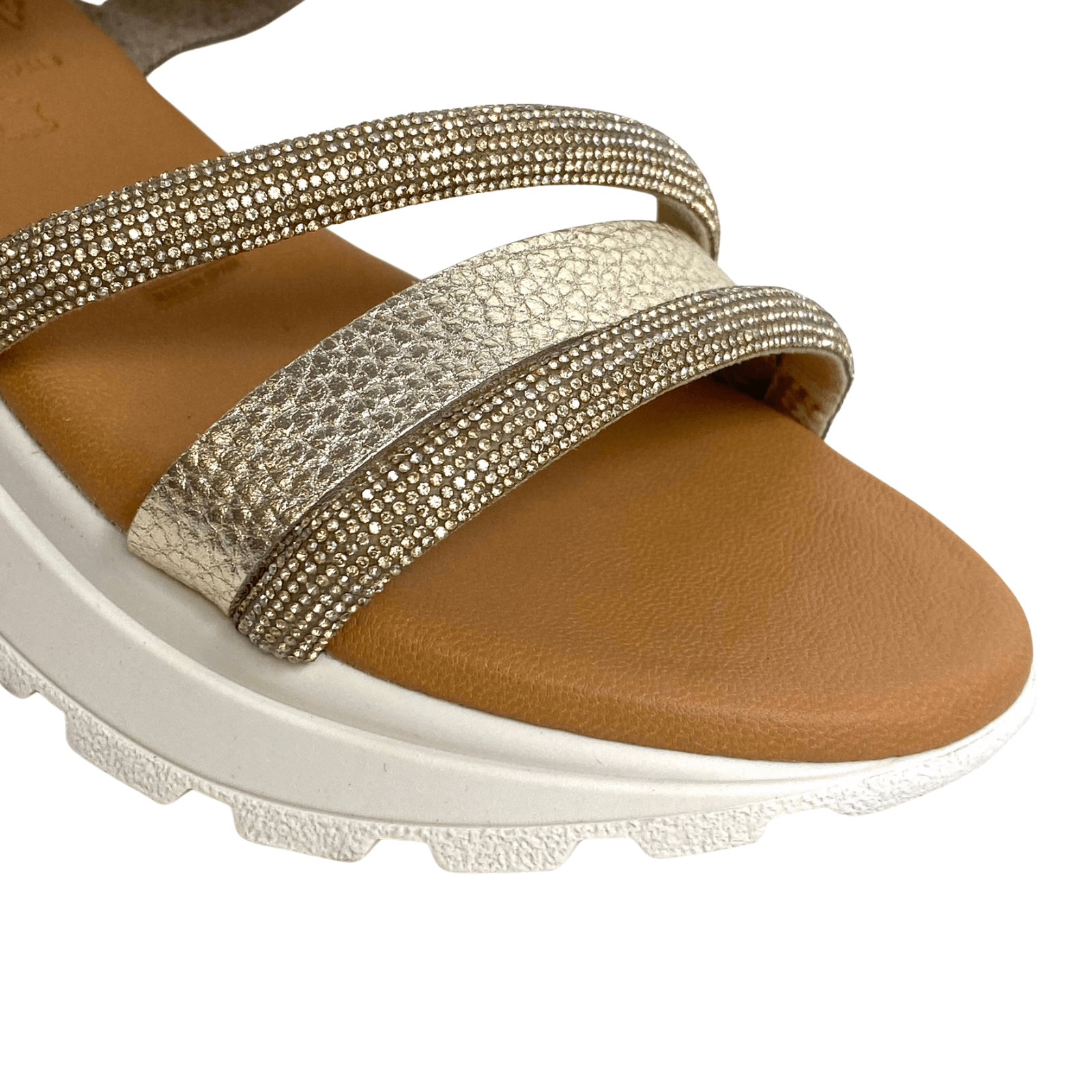 Ladies gold Leather, off white chunky sole sandal with velcro ankle strap.