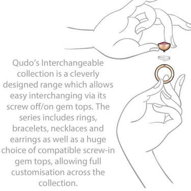Qudo’s Interchangeable collection is a cleverly designed range which allows easy interchanging via its screw off/on gem tops. The series includes rings, bracelets, necklaces and earrings as well as a huge choice of compatible screw-in gem tops, allowing full customisation across the collection. Please ensure gem top is screwed on tightly before each wear and a black rubber spacer is worn at all times.