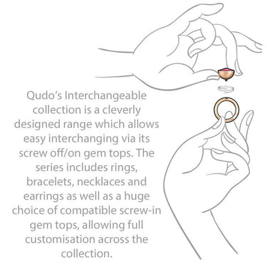 Qudo’s Interchangeable collection is a cleverly designed range which allows easy interchanging via its screw off/on gem tops. The series includes rings, bracelets, necklaces and earrings as well as a huge choice of compatible screw-in gem tops, allowing full customisation across the collection. Please ensure gem top is screwed on tightly before each wear and a black rubber spacer is worn at all times.