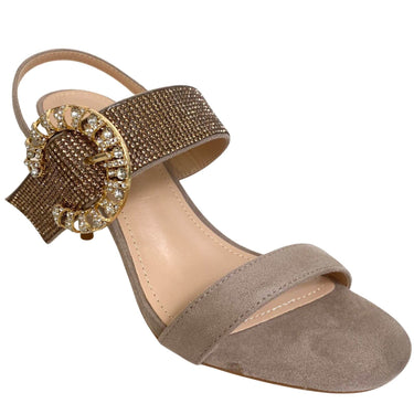 Ladies high heeled sandals from the Una Healy footwear collection. In a pale nude suede these sandals are will be a wardrobe staple. Complete with gold sparkly details & buckle.