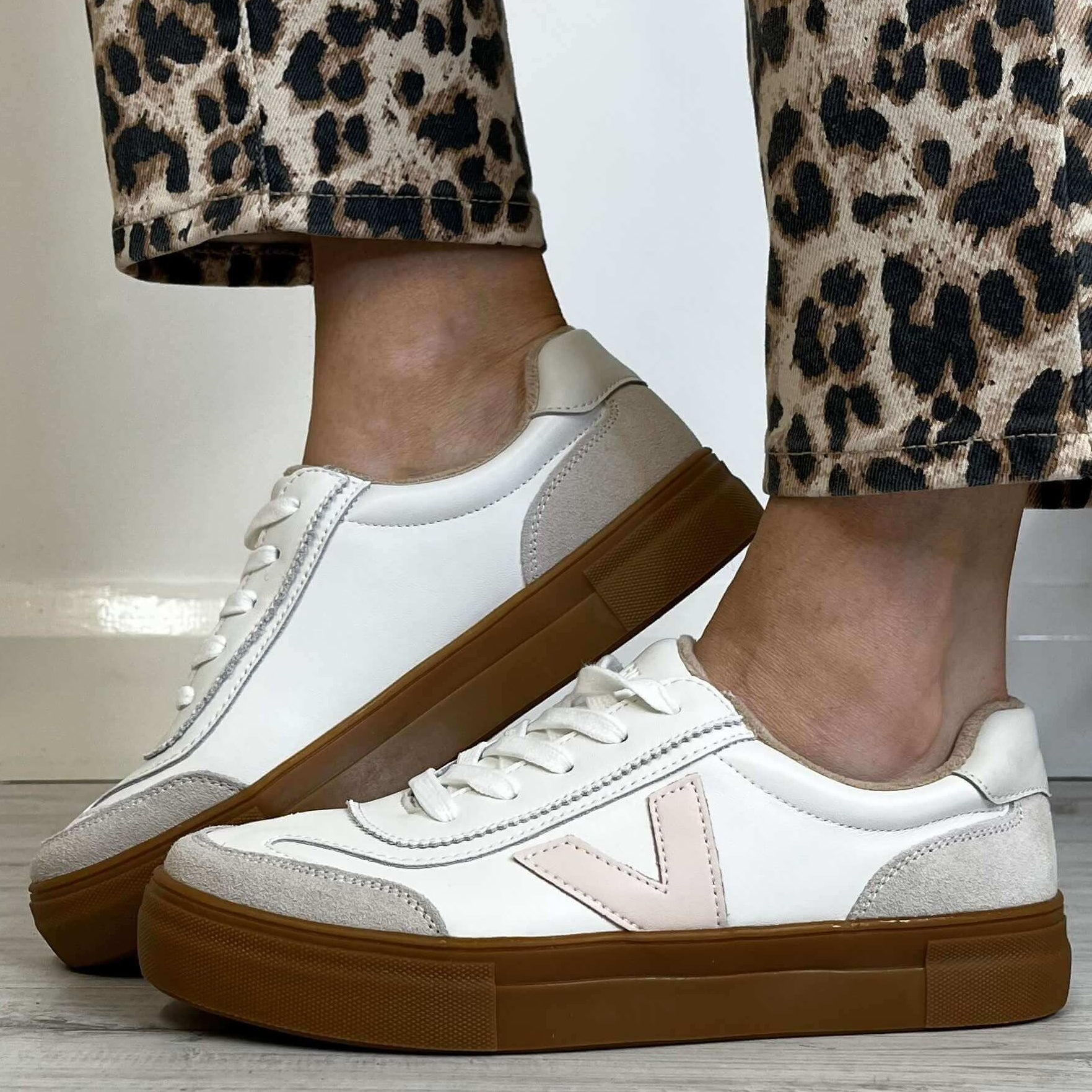 Pale pink and white leather effect sneakers from Drilleys with elevated gum sole.