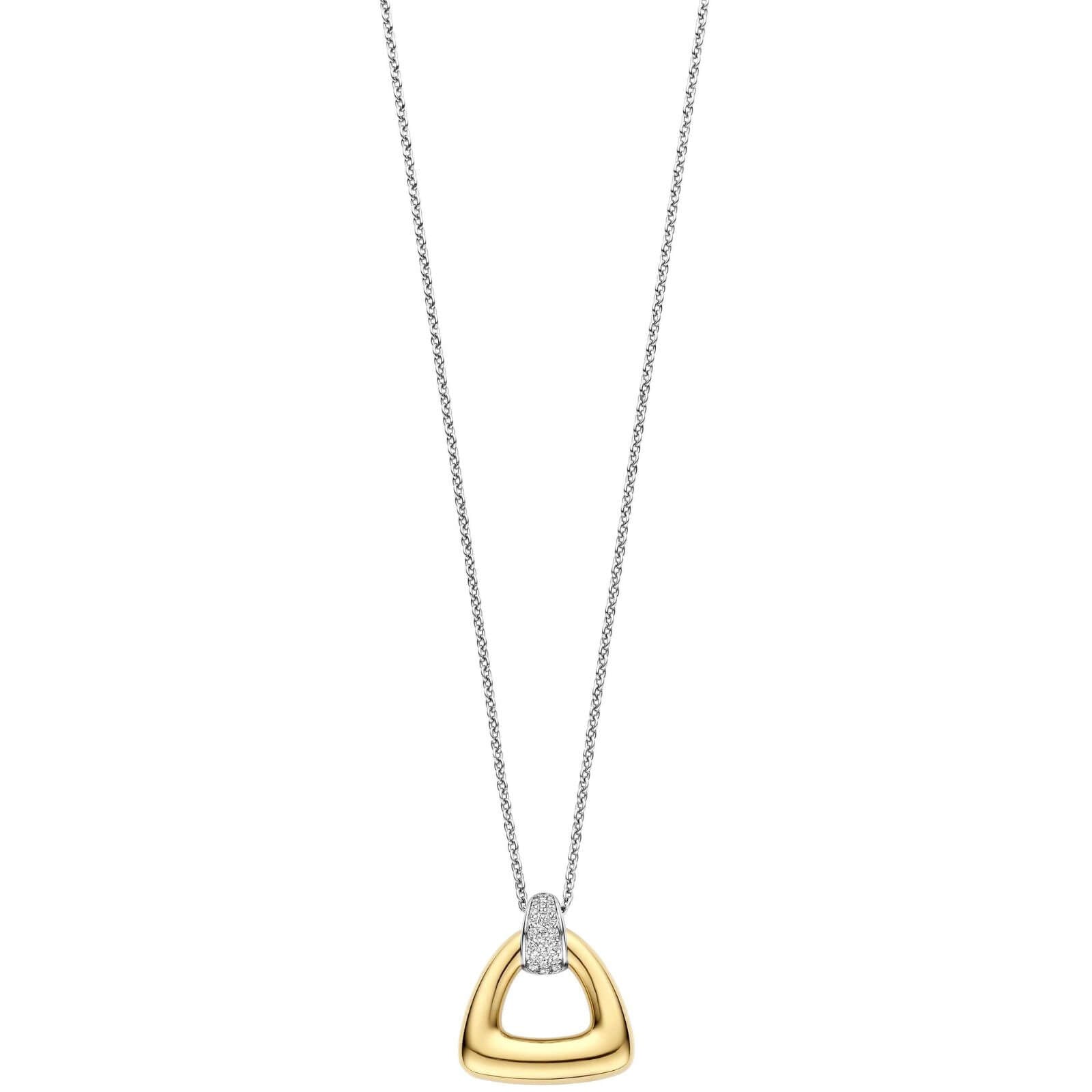 Celebrate sculptural simplicity with this TI SENTO gold-plated silver Necklace. The pendant features a bold, triangular silhouette softened by smooth, curved edges and finished in radiant yellow gold plating. Suspended from a pavé-set bail of white cubic zirconia, the design strikes a perfect balance between minimalism and glamour. Crafted from premium 925 sterling silver, this geometric pendant rests effortlessly on the décolleté, catching light with every movement. An elegant piece of designer jewellery that fits seamlessly into both modern and classic wardrobes, this gold-plated pendant necklace is ideal for those seeking refined, timeless pieces