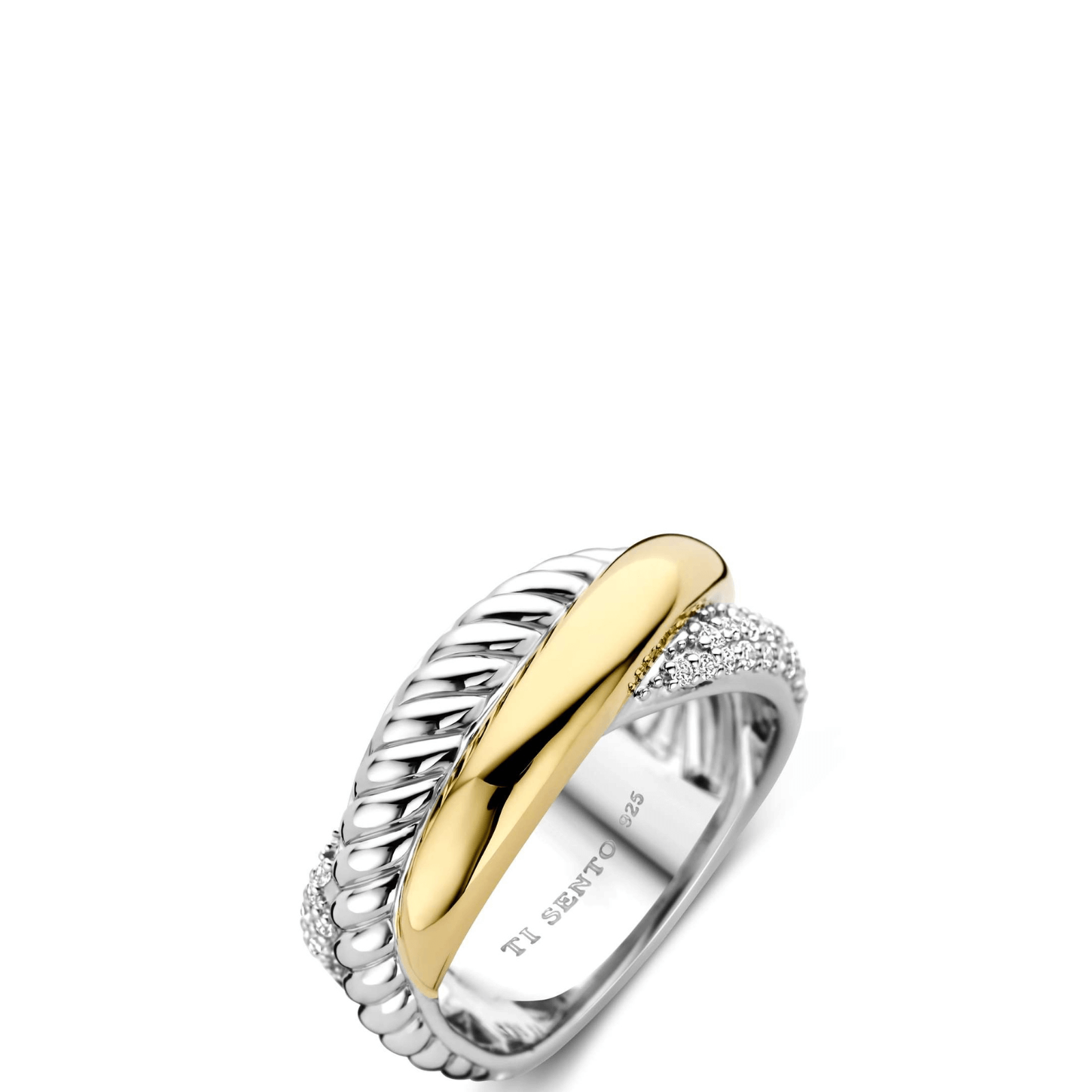 Indulge in the captivating interplay of textures and metals with this TI SENTO gold-plated silver Ring . This bold and sculptural piece features three intertwined bands: one is plated in lustrous yellow gold, creating a warm contrast against the cool silver of the other two. Another boasts a twisted design, adding a touch of dynamism, and the third band is adorned with a dazzling pave of white cubic zirconia stones, adding a touch of opulent shine to the piece. Crafted from 925 sterling silver and plated with platinum for lasting brilliance, this ring is a testament to modern luxury.