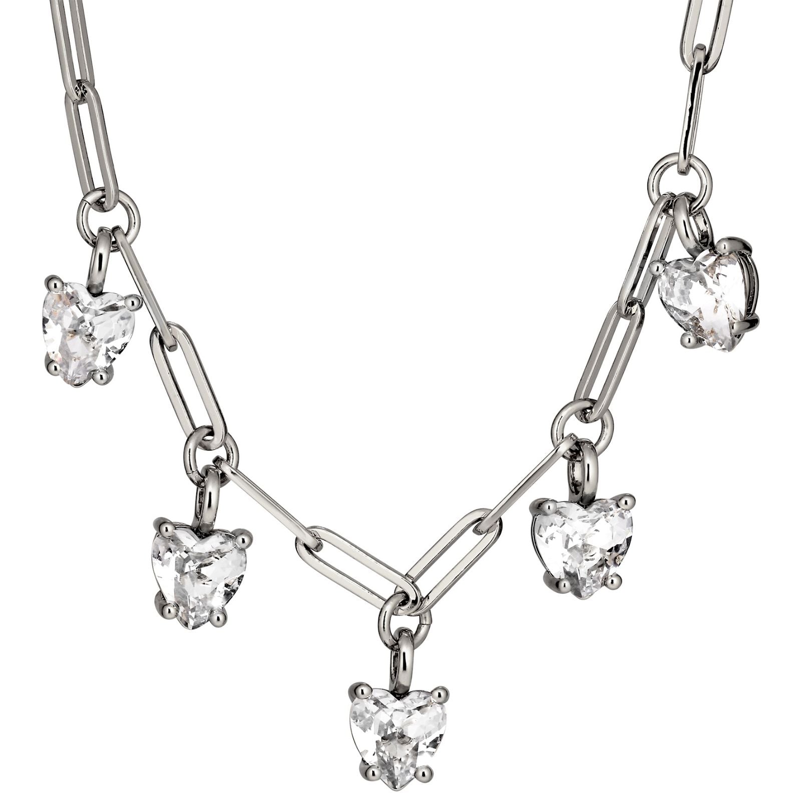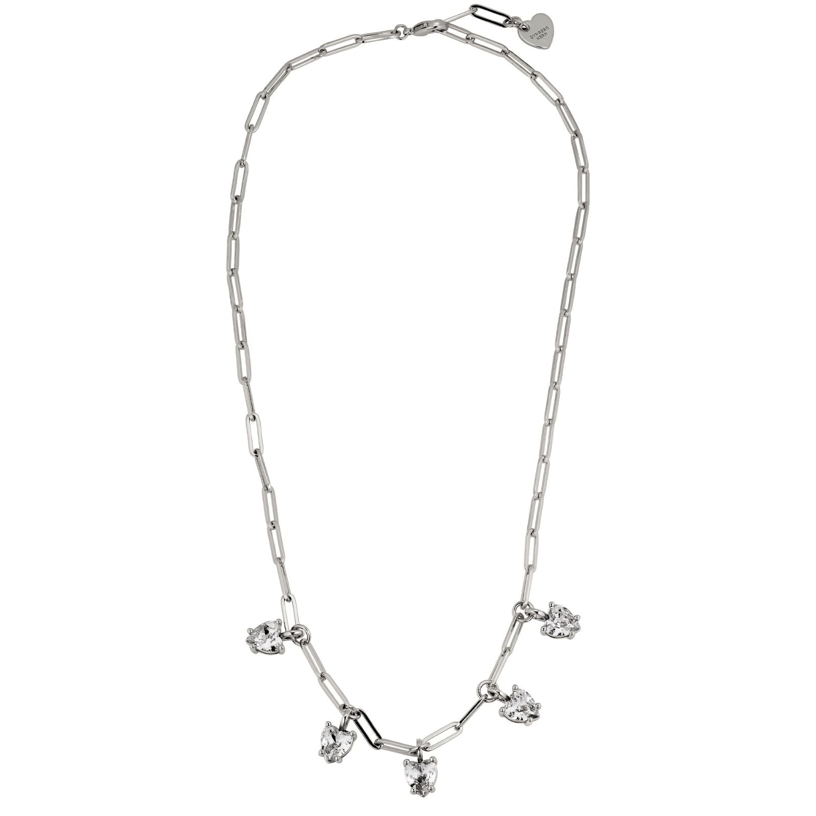 SOUL is a soulful and elegant chain made with five heart shaped facet cut crystals as pendants.. Chain made in stainless steel, pendants in polished brass. Here shown in silver tone finish with white crystals.