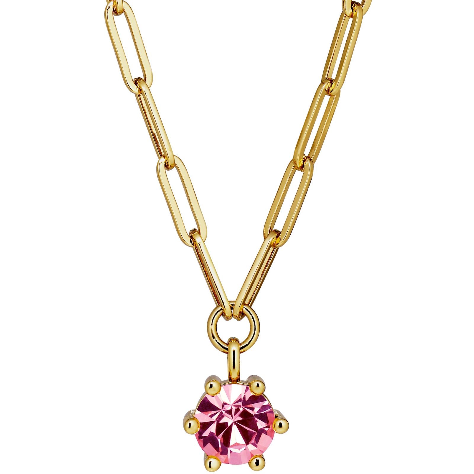 TESSA is a cool and chunky short neck chain made in linked design. The pendant features a large pink toned crystal in a classic prong setting. Chain and pendant made in brass. Here shown in shiny gold tone finish.