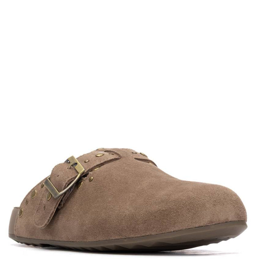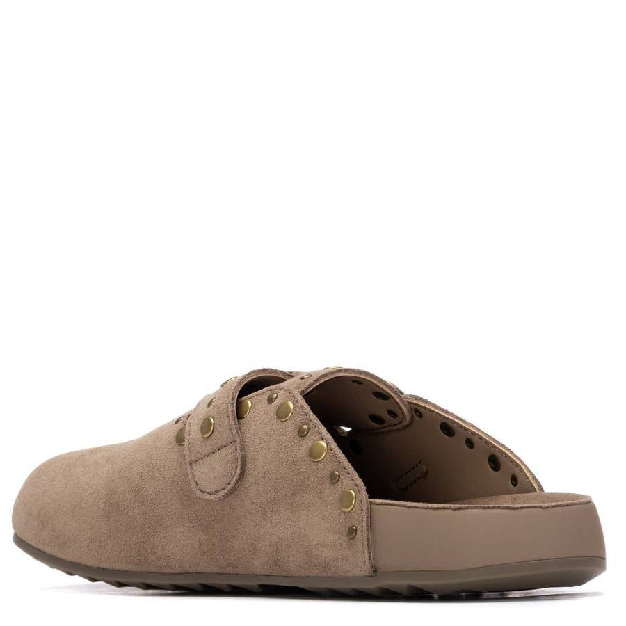 Ladies XTI trending clog style shoes in a suede effect. These light weight cork style sole slip on shoes are finished with buckle to the side.