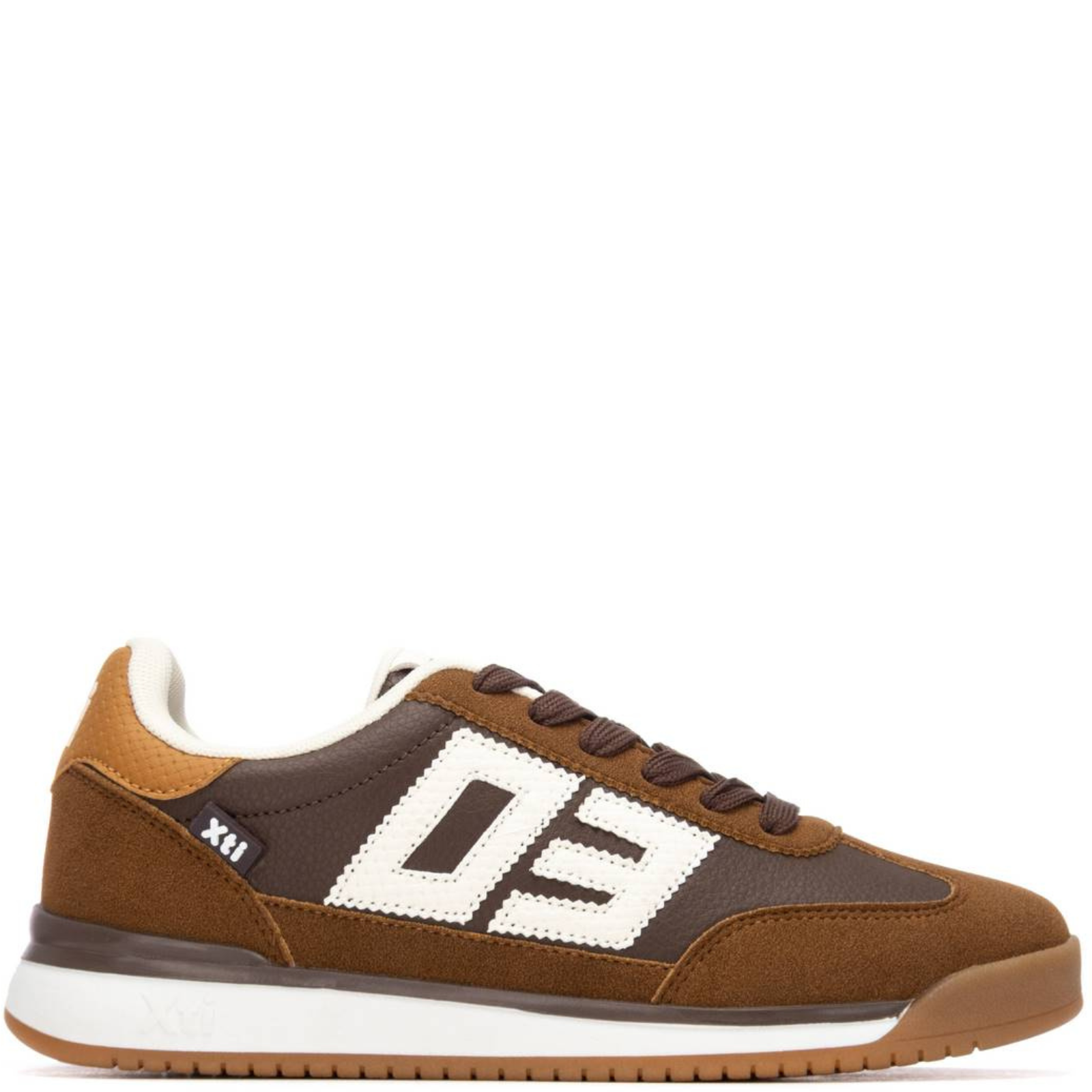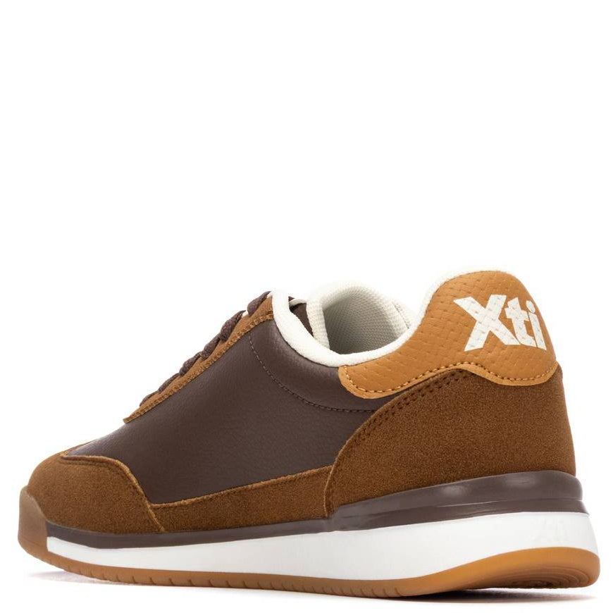 Brown and tan sneaker with 'Xti' branding on a white background
