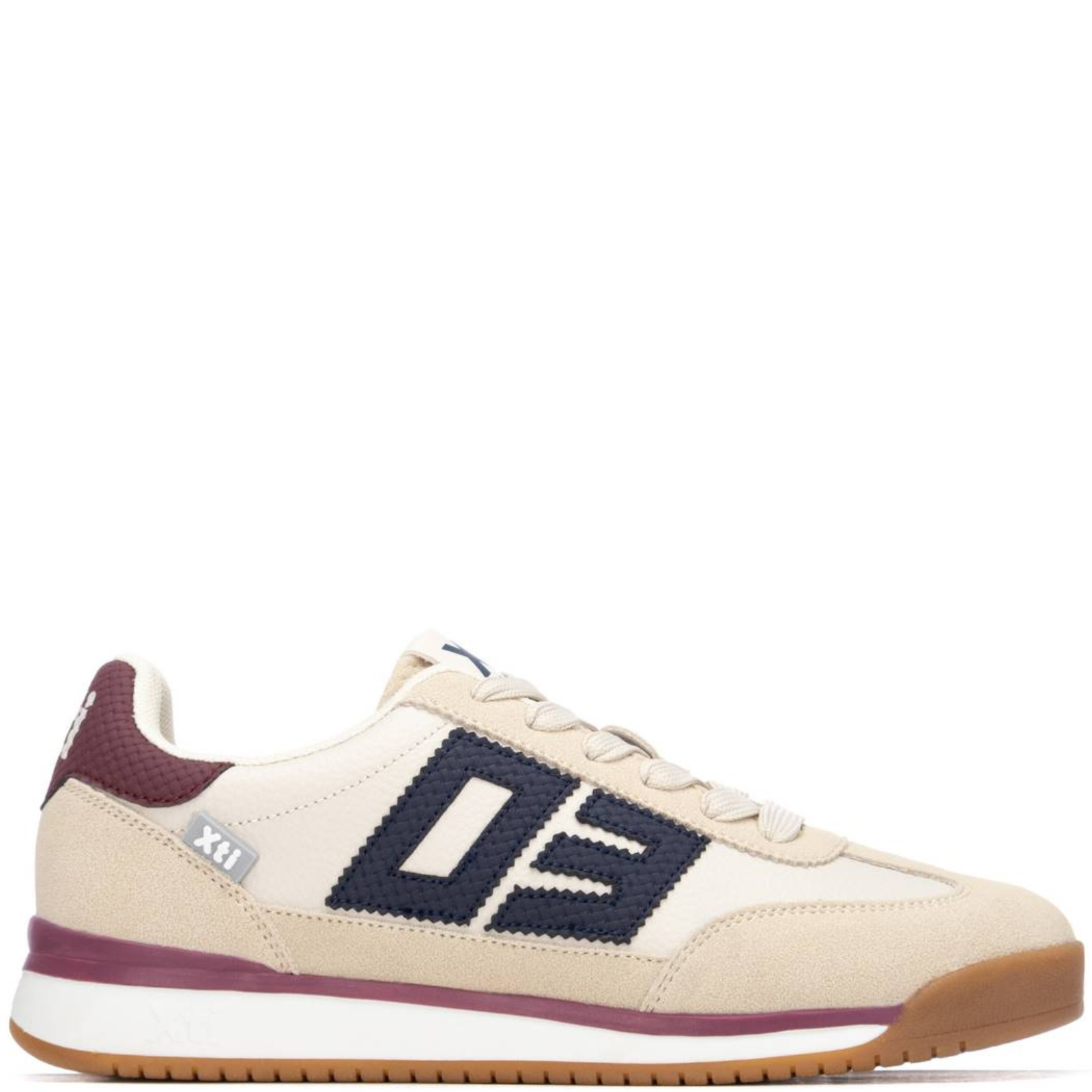 Beige sneaker with maroon accents and 'Xt' logo on a white background