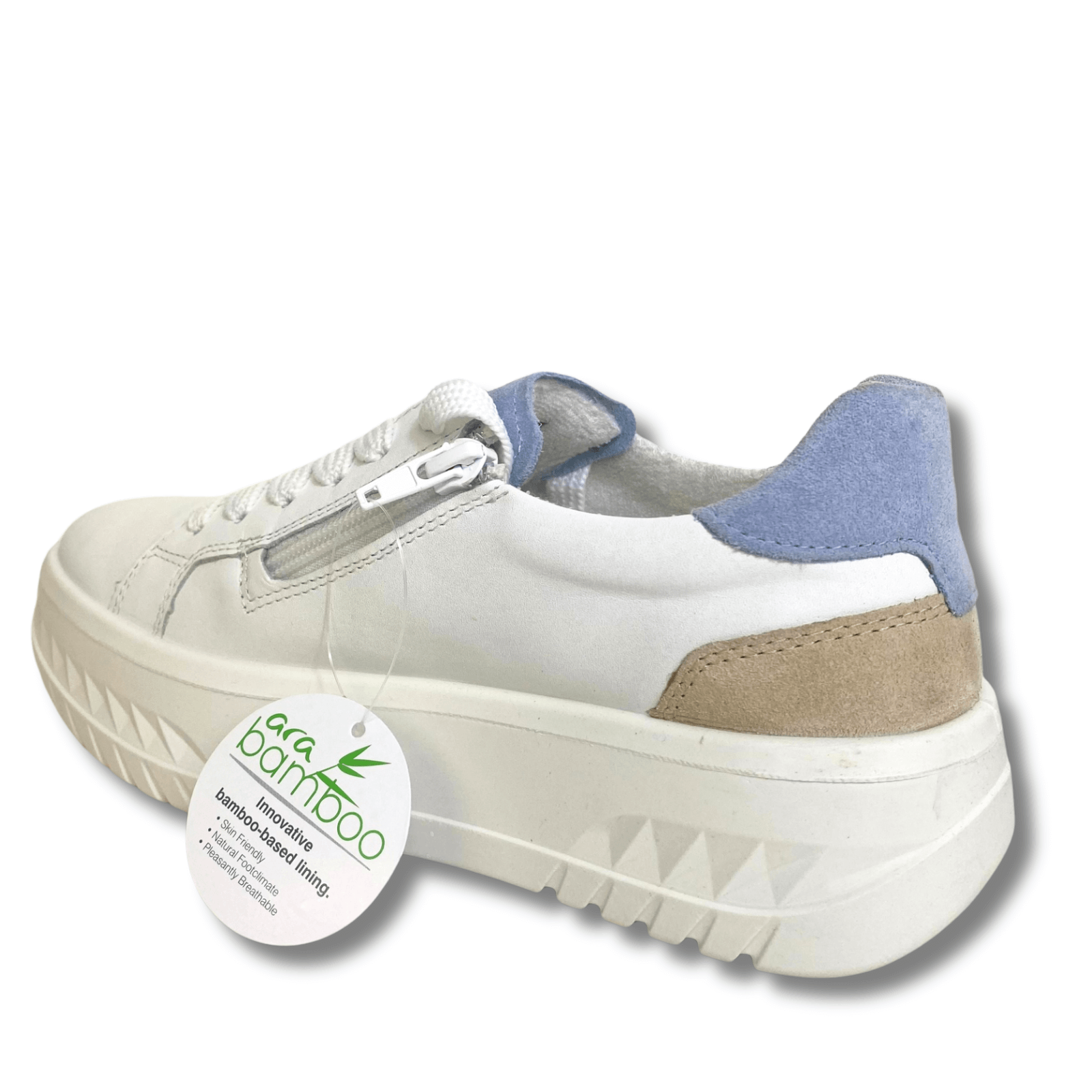 These ladies white toned leather sneakers are a classic style with Ara's iconic HighSoft technology sole. In a fabulous neutral & pale blue mix they're complete side zip. These ladies fashionable trainers are complete with elevated sole for ultimate comfort. T
