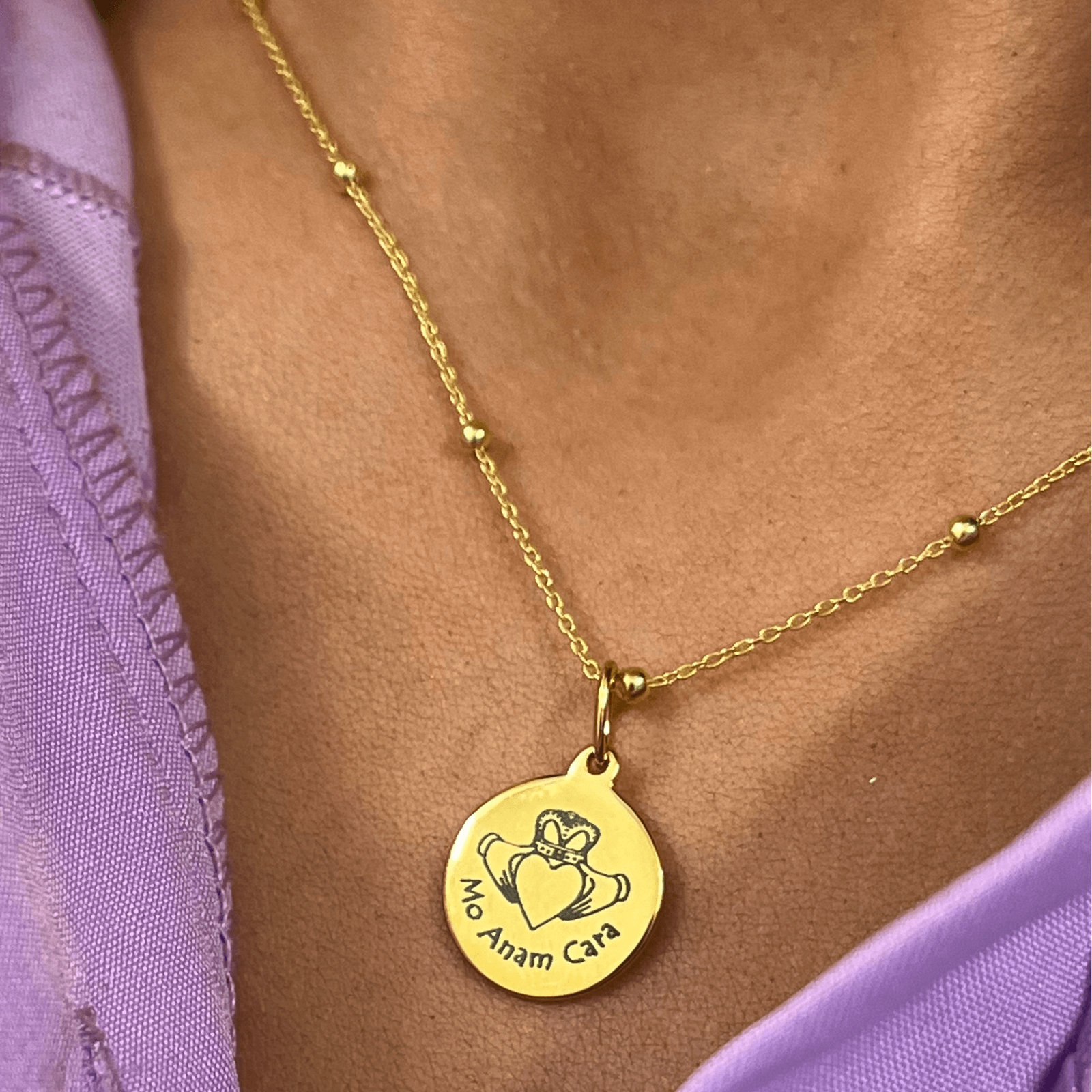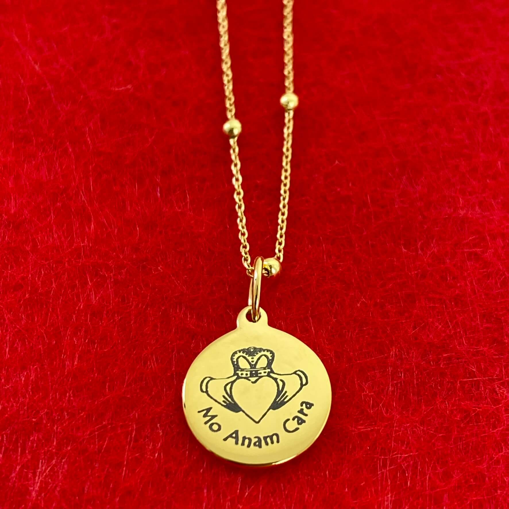 Celebrate the bond of true love & friendship with this sterling silver pendant and bobble chain, featuring an engraved Claddagh symbol and the Irish phrase "Mo Anam Cara"—meaning "my soul friend." The delicate disc pendant captures the timeless Claddagh design, a symbol of love, loyalty, and friendship, making it a meaningful gift for Valentine's Day or any occasion honouring deep connections. Crafted in quality sterling silver with a contemporary bobble chain, this piece combines heritage symbolism with modern elegance. A thoughtful choice for those who value authentic, sentimental jewellery.