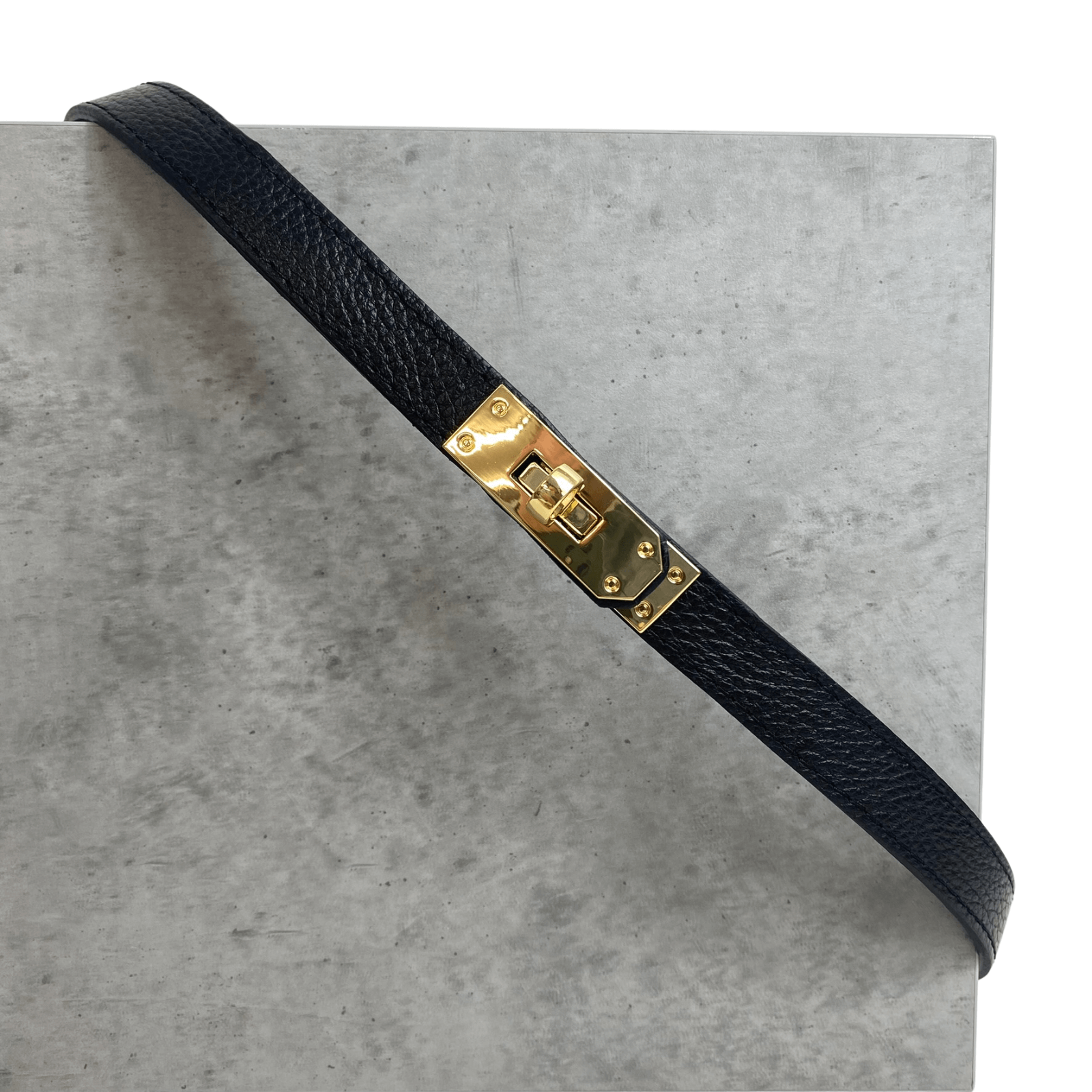 Luxury black leather belt with gold buckle, adjustable sizing Please note this is a high waisted belt not suitable for trousers, but prefect for dress or shirts.