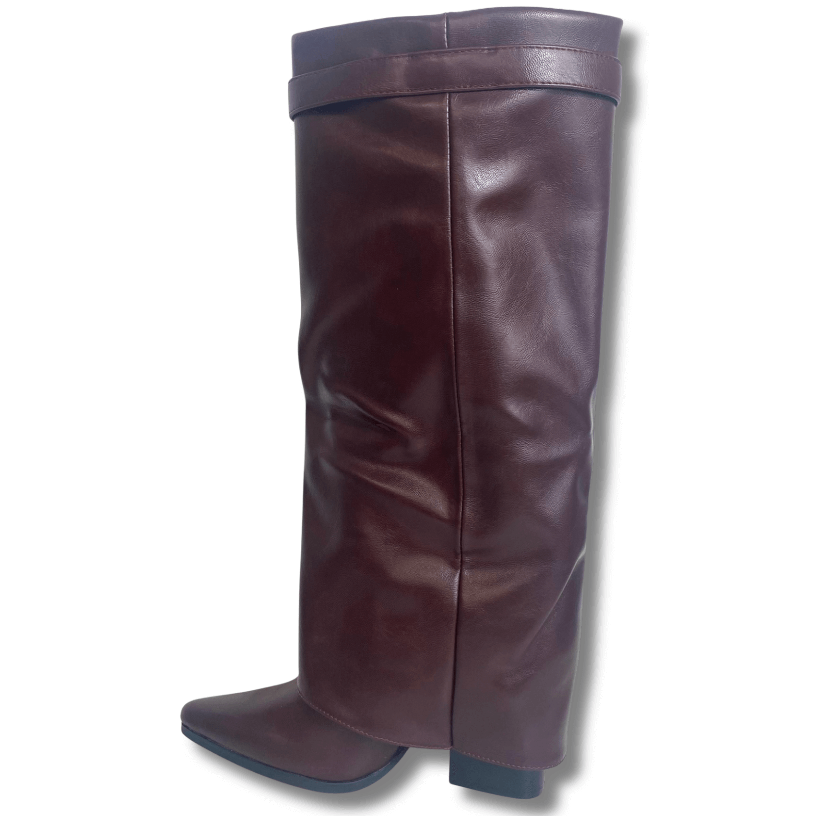 Introducing our latest fold over boots they are the ultimate night-out boot. A glamorous play on the cowboy boot trend. Featuring a luxury vegan leather material, just below knee-high height and block heel - we are obsessed.
