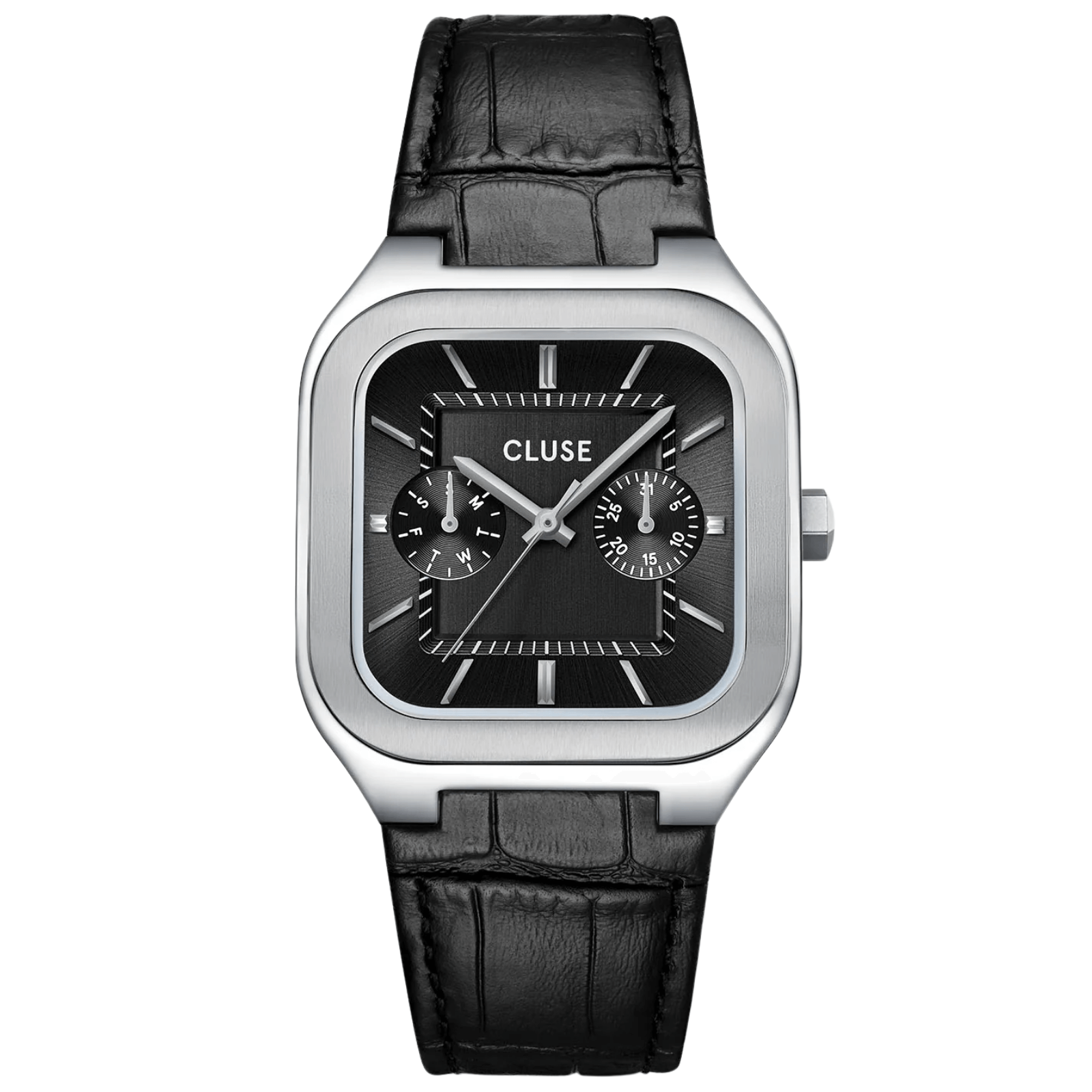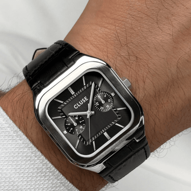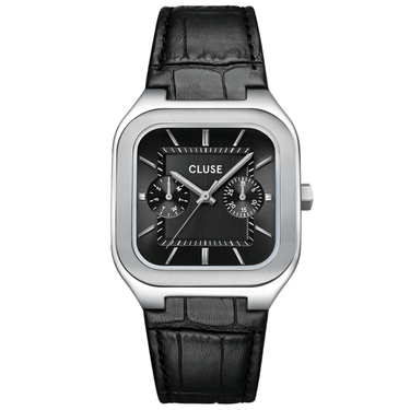 Cluse Quadrus Silver Leather Strap Watch - Black