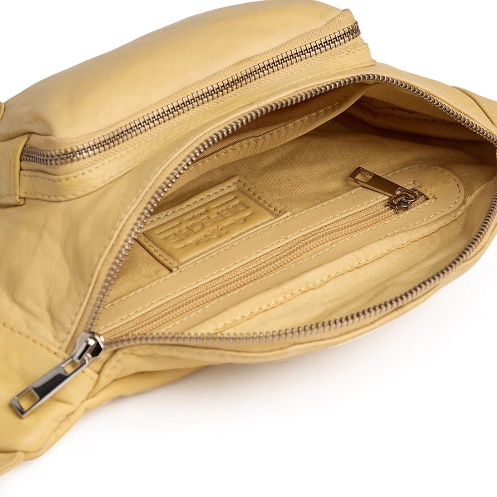 pale yellow leather waist bag with zippers on a white background