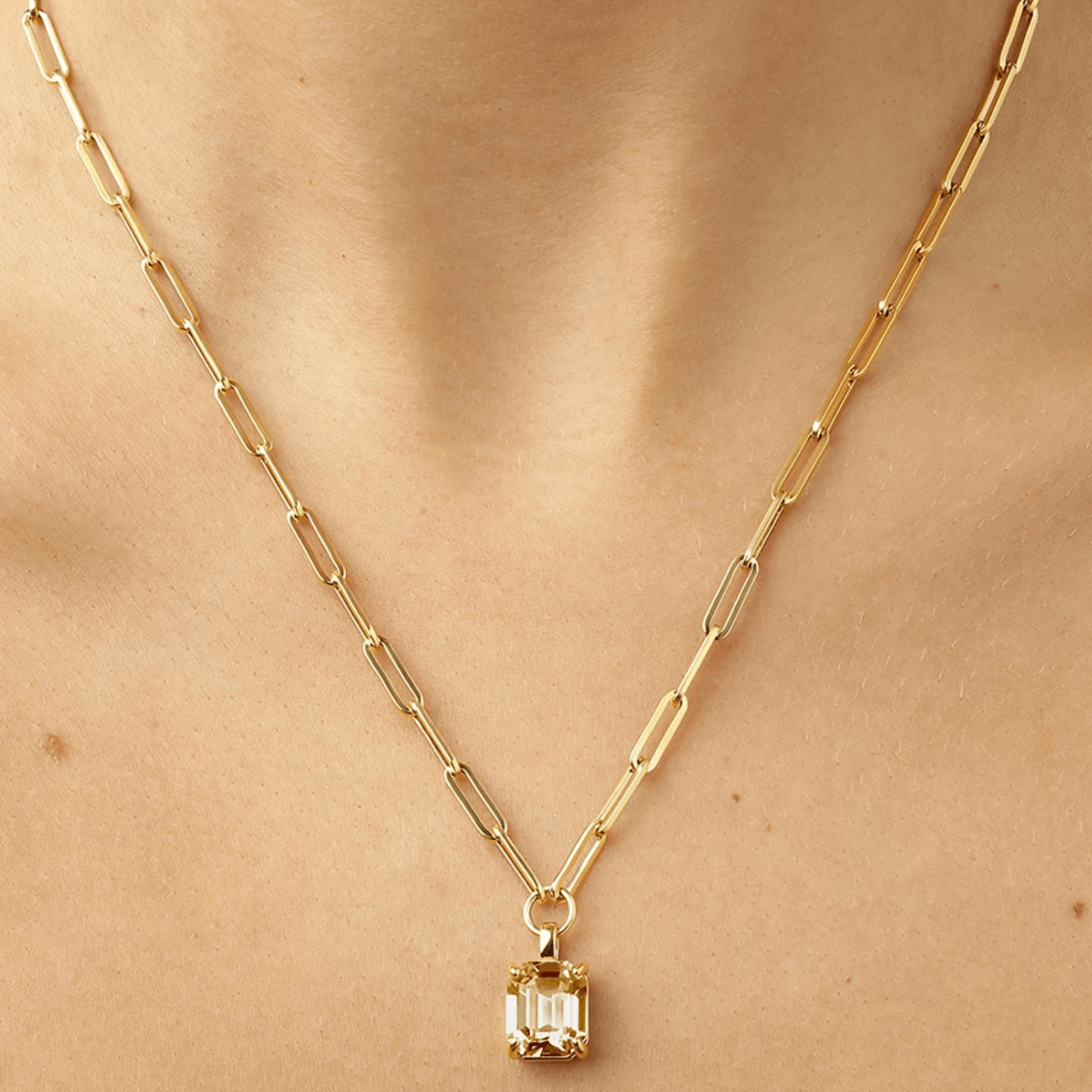 OCTA - A beautiful and Art Deco inspired classic neck chain, gold plated stainless steel - and adorned with a solitaire emerald cut crystal set in a classic prong setting. Here shown in a golden toned crystal version on gold tone base.