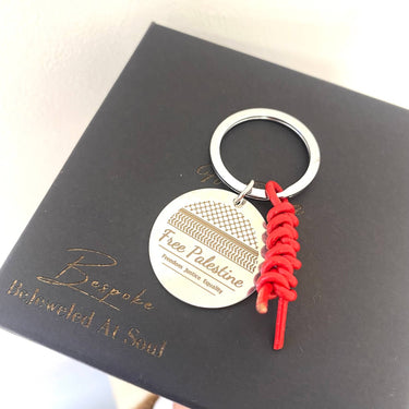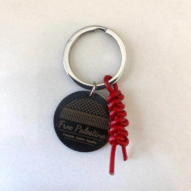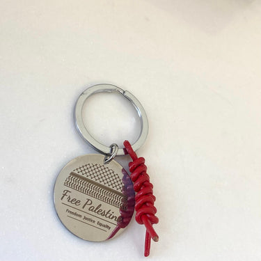 Engraved stainless steel keyring with laser engraved scarf pattern and text on the front. The pattern is from the traditional Palestinian scarf called a Keffiyeh. Text - "Free Palestine. Freedom Justice Equality." Complete with red leather woven detail. Representing a powerful symbol of support for a profound cause. Crafted with attention to detail, love and quality, this keyring embodies resilience and solidarity.