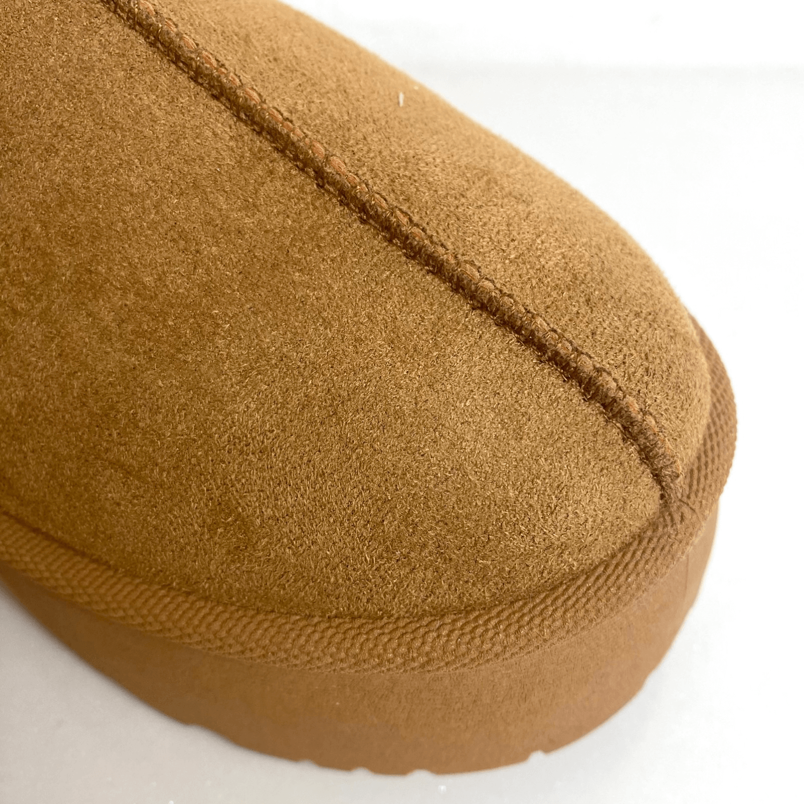 Ladies slip on slippers with elevated sole. Fluffy lined.