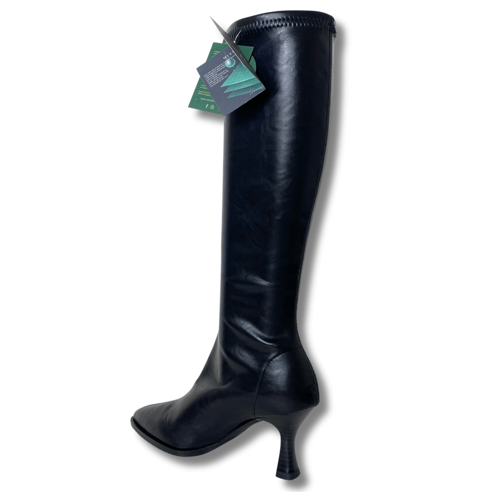 Ladies mid height curved heel boots from the Spanish footwear brand Miss Elastic. In a fabulous long length boot design these dressy boots are definitely made for your fav trousers and midi dresses. Complete with a chic pointed toe in black faux leather.