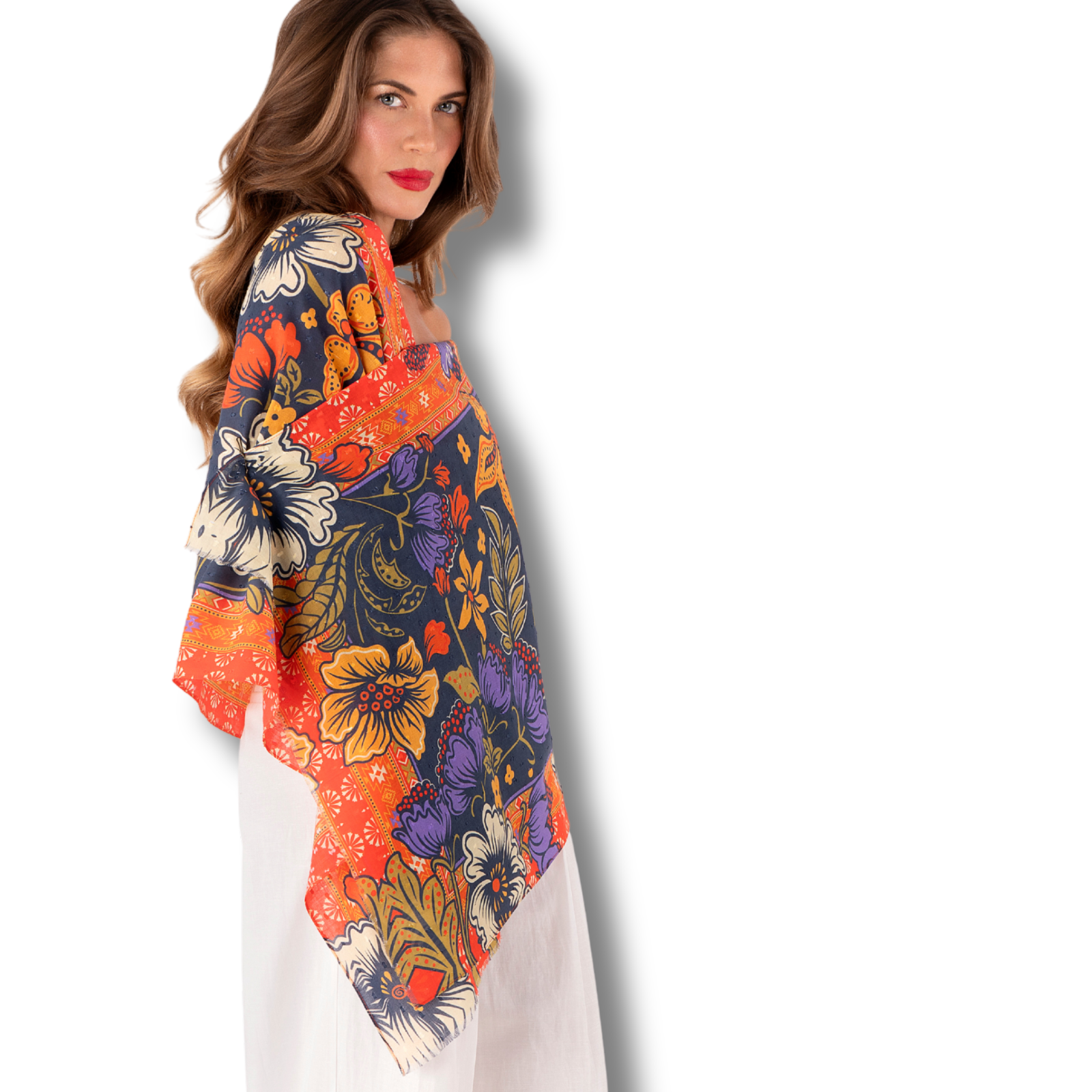 Woman wearing a colorful floral scarf on a white background