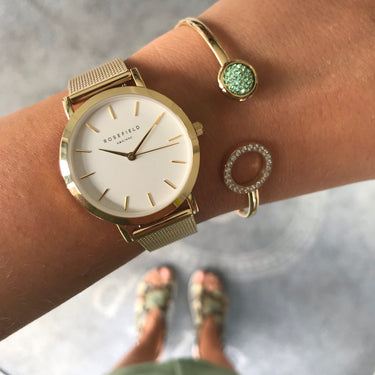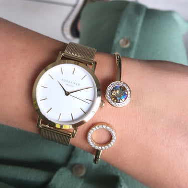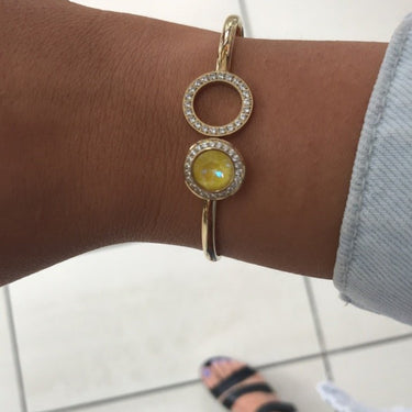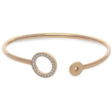 This is a gold plated stainless steel Cassine composable bangle from Qudo. Match your favourite ring top on this bangle, simply screw the ring top into the thread at one side of the bangle.