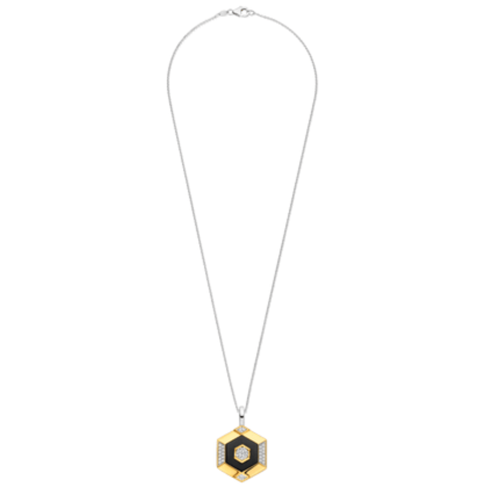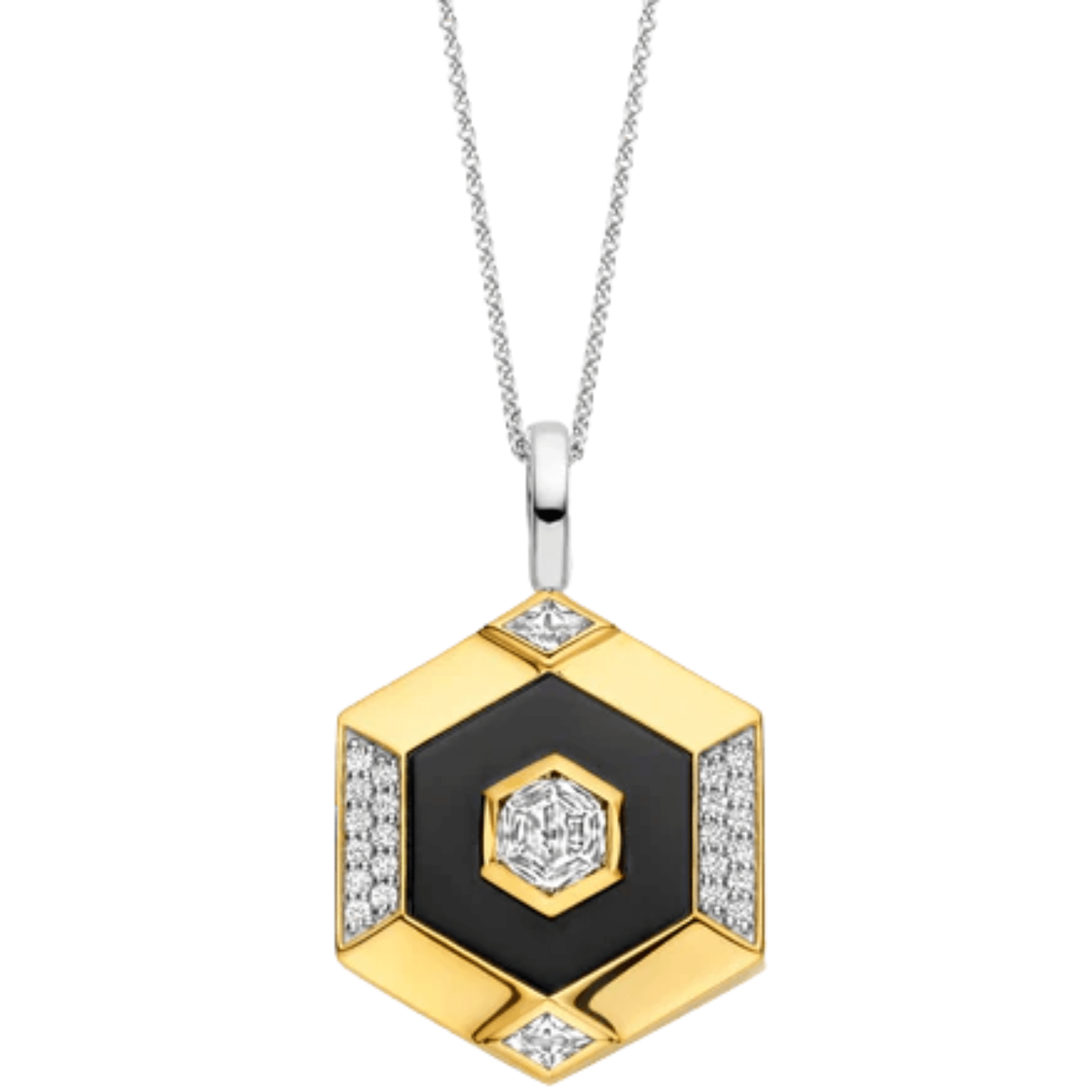 Embrace vintage glamour with a modern twist in this TI SENTO gold-plated silver Pendant 6838BL. Crafted from 925 sterling silver and plated with gleaming yellow gold, this geometric stunner is guaranteed to add a touch of opulence to any outfit. The striking hexagon shape frames a luxurious black stone, its rich colour captivating the eye. Delicate cubic zirconia stones dance around the edge adding a hint of sparkle. This statement pendant is a conversation starter, adding a touch of nostalgia to any look.
