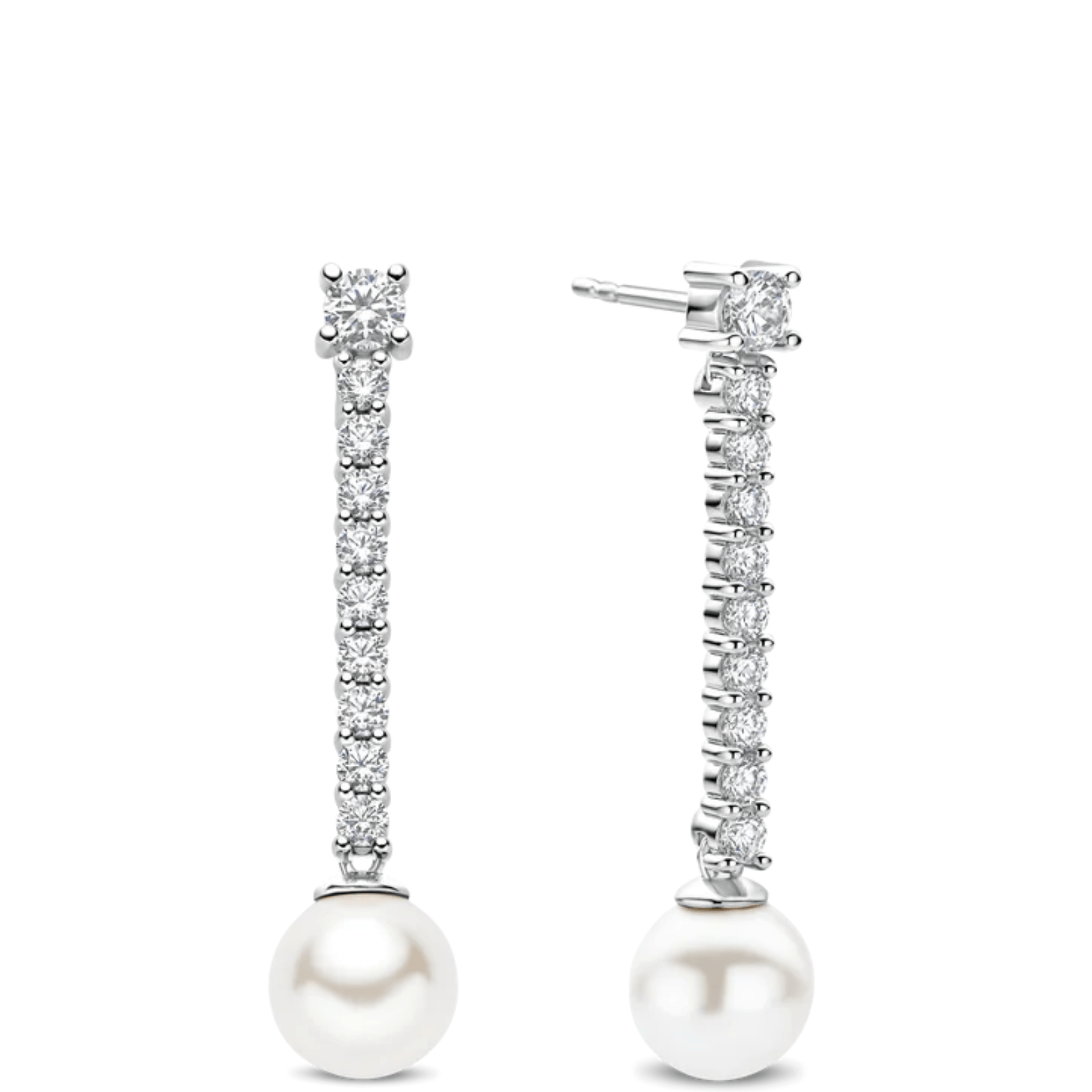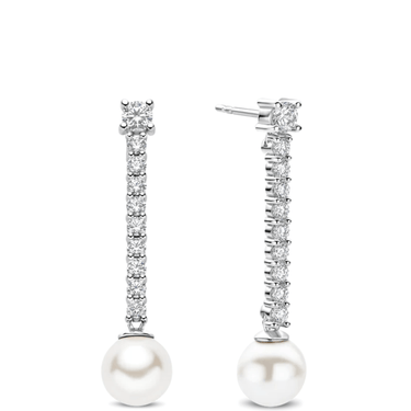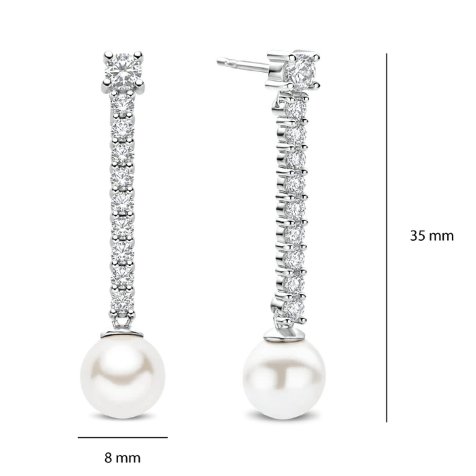 These long zirconia pearl earrings are crafted from high-quality 925 sterling silver and designed as elegant stud earrings. A slender row of sparkling zirconia stones runs vertically downward, finished at the base with a luminous pearl. The combination of fine zirconia and the soft lustre of the pearl creates a refined play of light and a beautifully balanced design.
