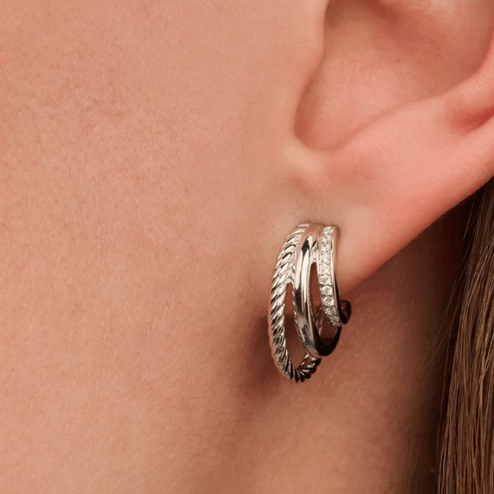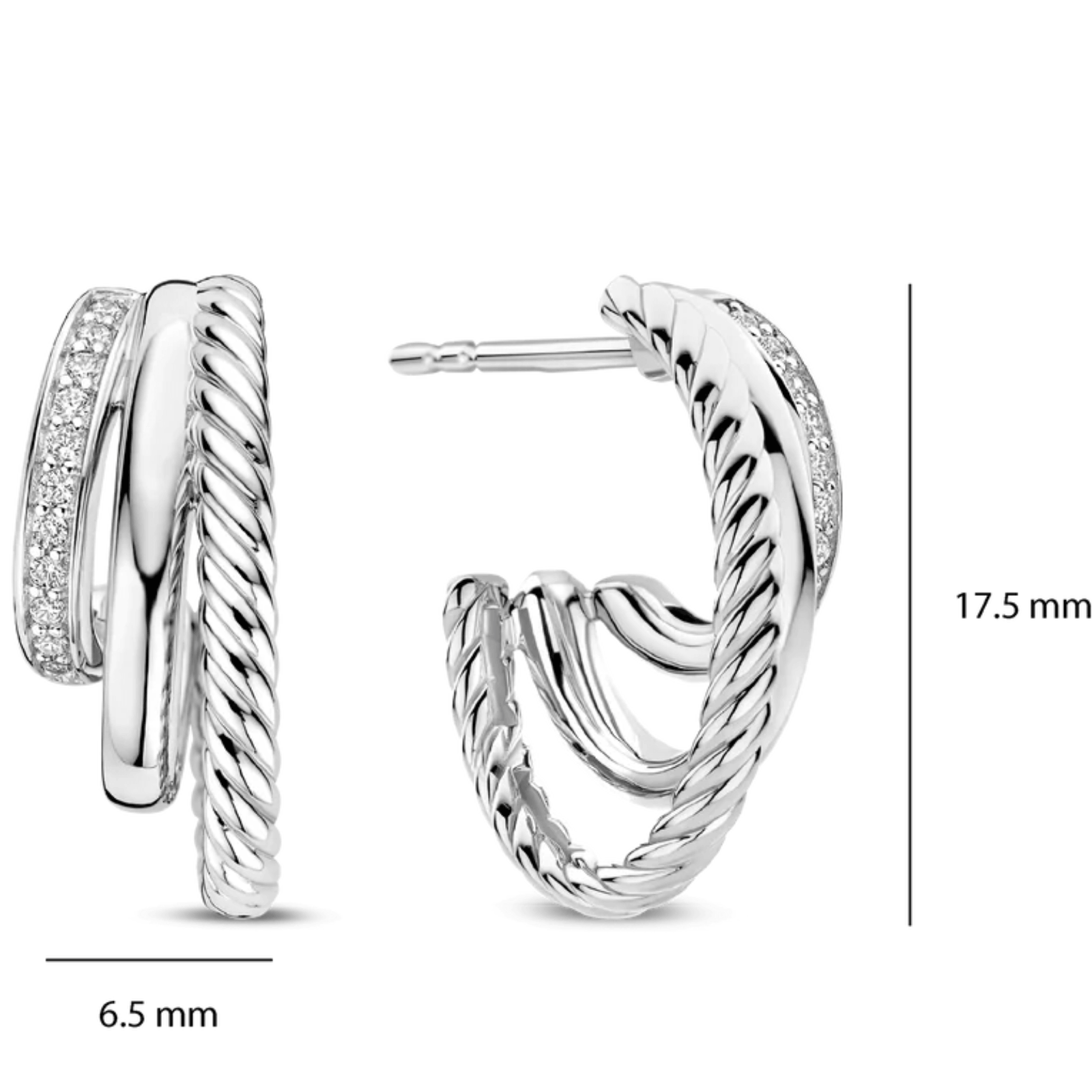 These Zirconia Structure earrings are crafted from high-quality 925 sterling silver and consist of three bands in different sizes, each with its own texture. One band is smooth, one features a ribbed texture, and one is set with carefully placed zirconia stones. The combination of structures creates depth and a refined play of light, while the zirconia subtly catches the light with every movement.