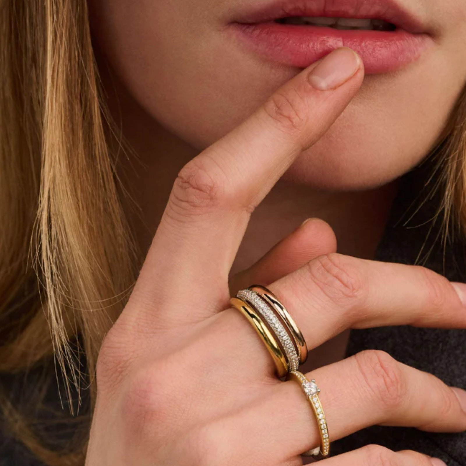 This tricolour ring with zirconia stones is crafted from high-quality 925 sterling silver and features a refined, layered design. The ring consists of three bands: one 18k gold-plated band, one band set with sparkling zirconia stones, and one rose gold-plated band. The combination of gold tone, silver tone and rose gold tone creates a dynamic composition with depth and contrast.