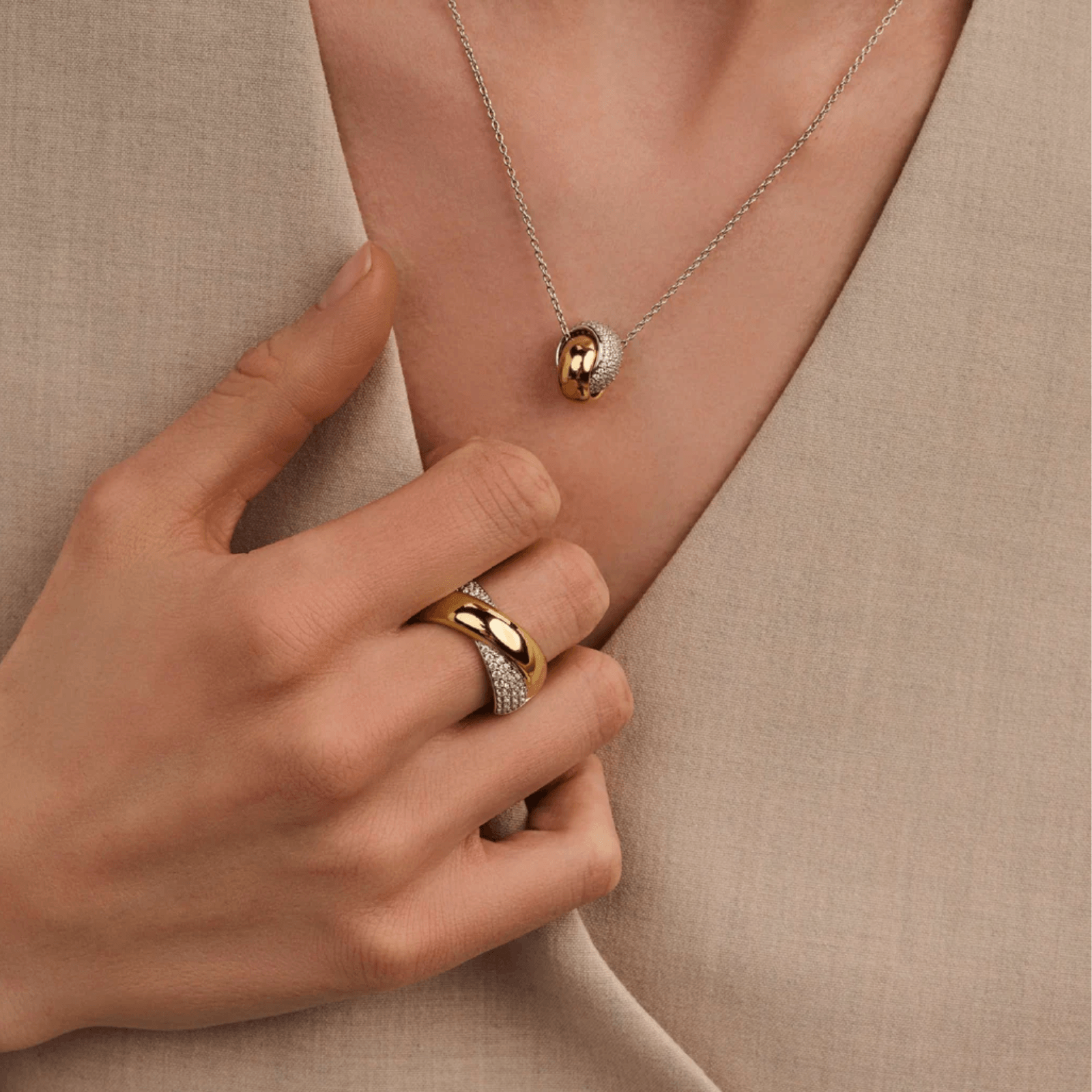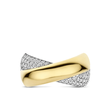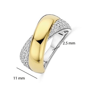 This Bold Zirconia Crossover Ring is crafted from high-quality 925 sterling silver and features a powerful, sculptural design. The ring consists of intersecting bands, one finished in smooth 18k gold-plating and the other set with sparkling zirconia stones. The contrast between the sleek polished band and the shimmering zirconia adds depth and gives the ring a distinctive presence.