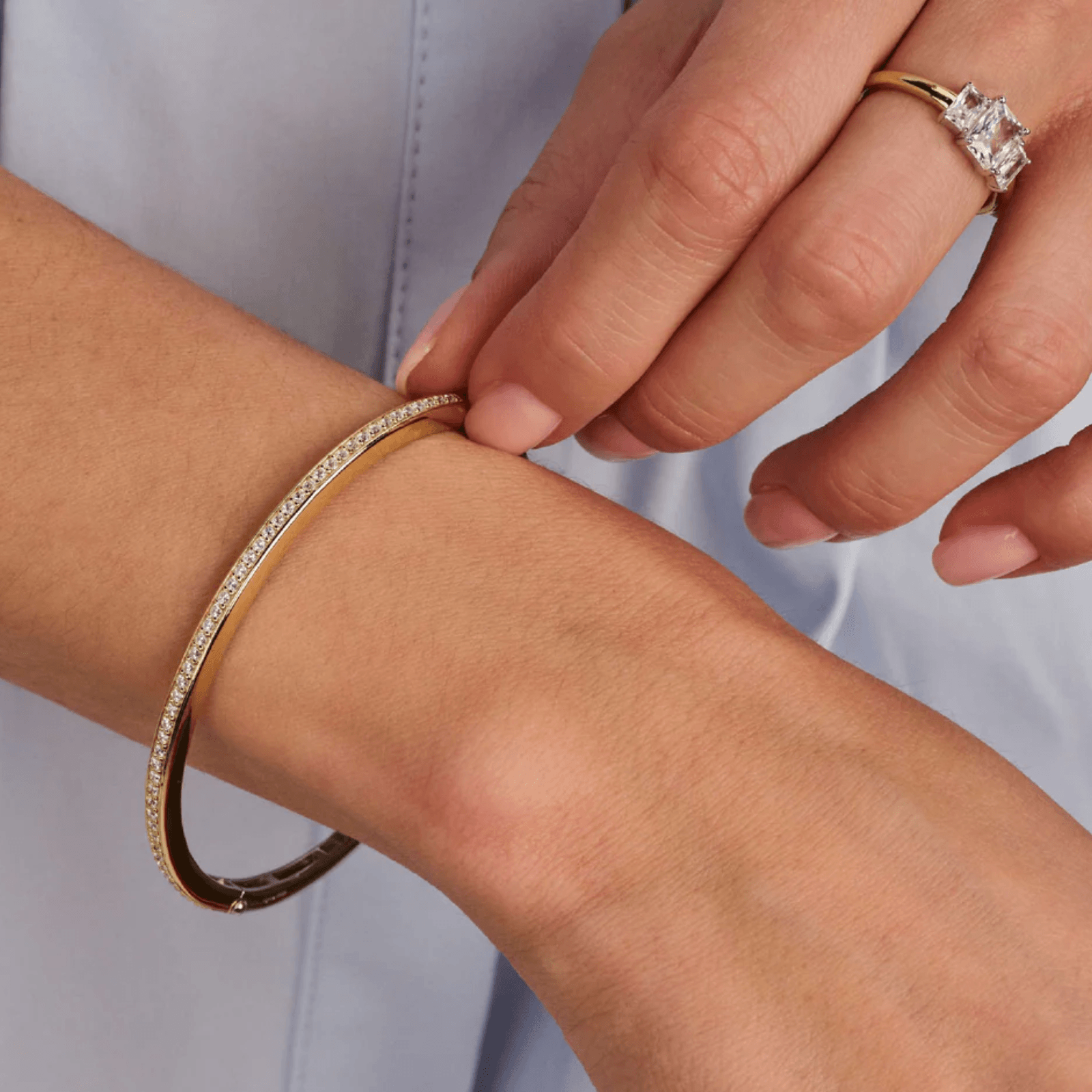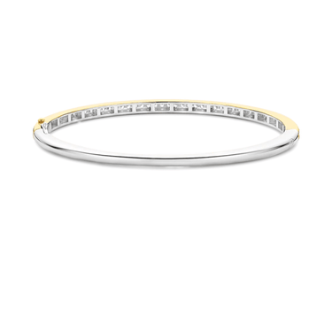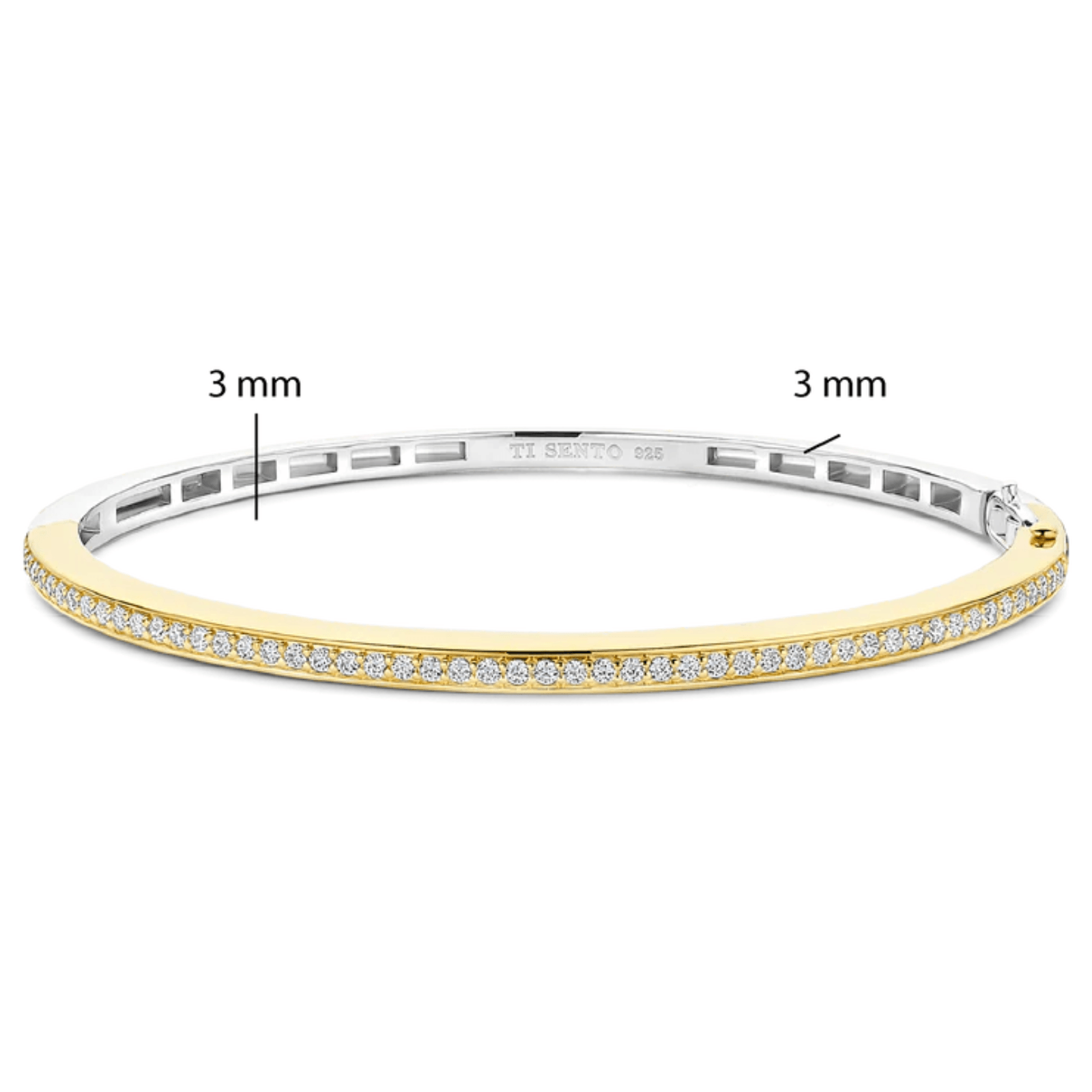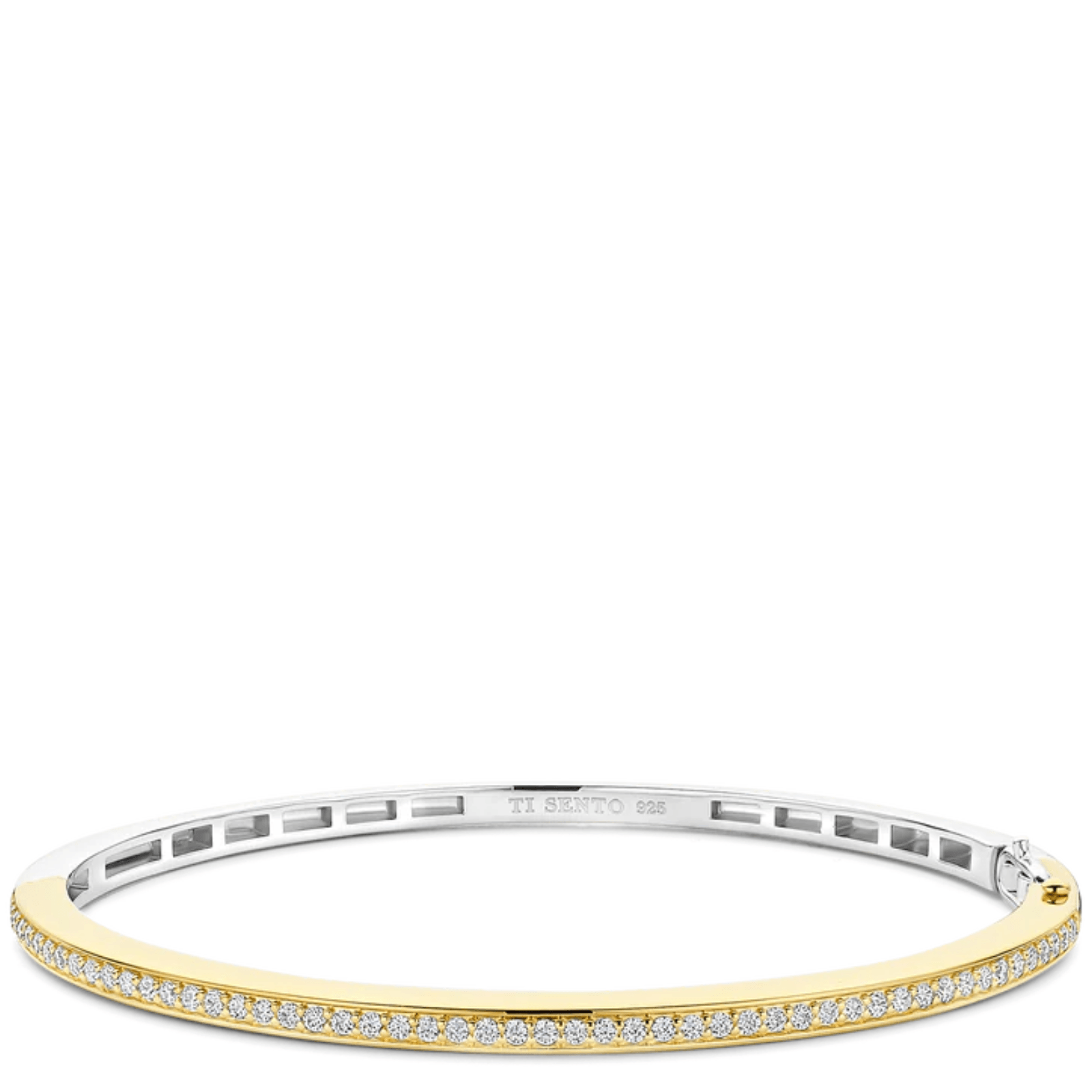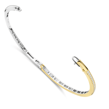 This bold crossover bangle bracelet is crafted from high-quality 925 sterling silver and features a strong, modern design. The bracelet consists of two intersecting bands: one smooth 18k gold-plated band and one band set with sparkling zirconia stones.