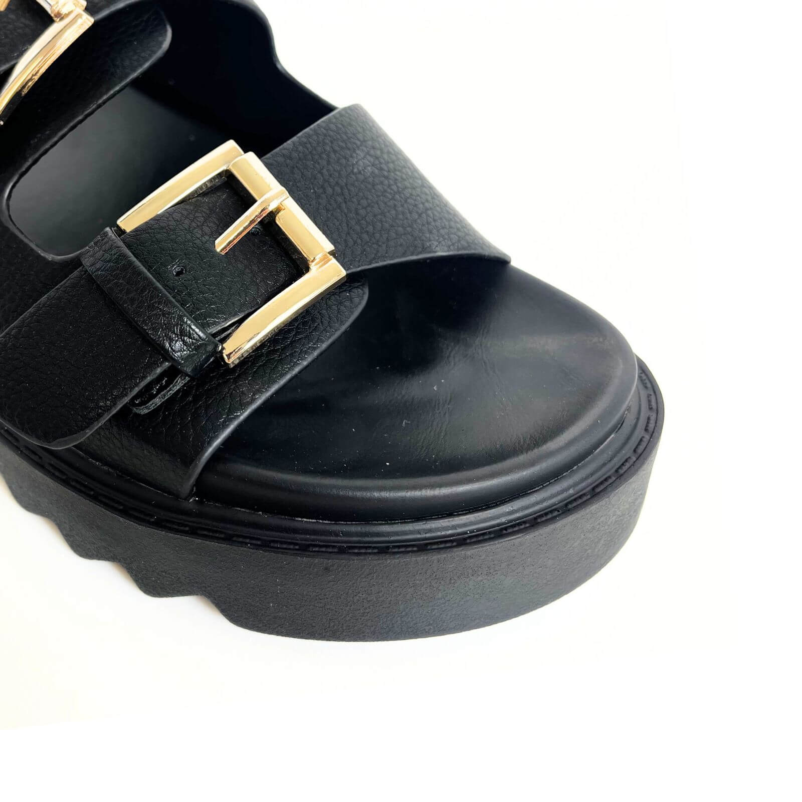 Double strap leather effect sandals, on a black chunky rubber sole, finished with gold hardware.
