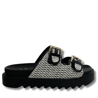 Double strap cream boucle design effect sandals, on a black chunky rubber sole. This slider style sandal is finished with gold hardware.