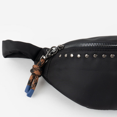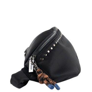 Women's nylon sling bag with zipper closure, complete with silver studding. Includes lining and interior pocket with zipper. Brand detail on metal tag.